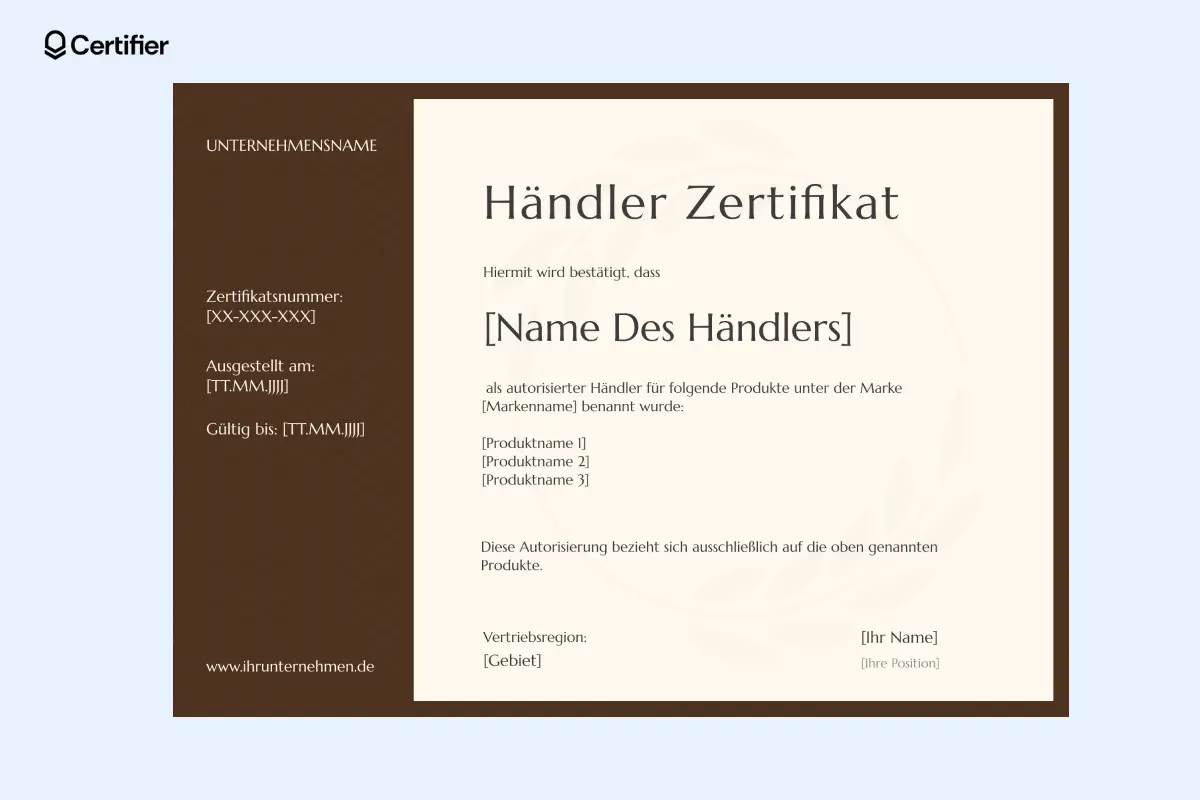 Diese Händlerzertifikat Vorlage richtet sich an Unternehmen mit einem klassischen Markenauftritt. Das professionelle Layout in warmen Brauntönen mit beiger Basis bietet eine strukturierte Darstellung aller relevanten Händlerinformationen.