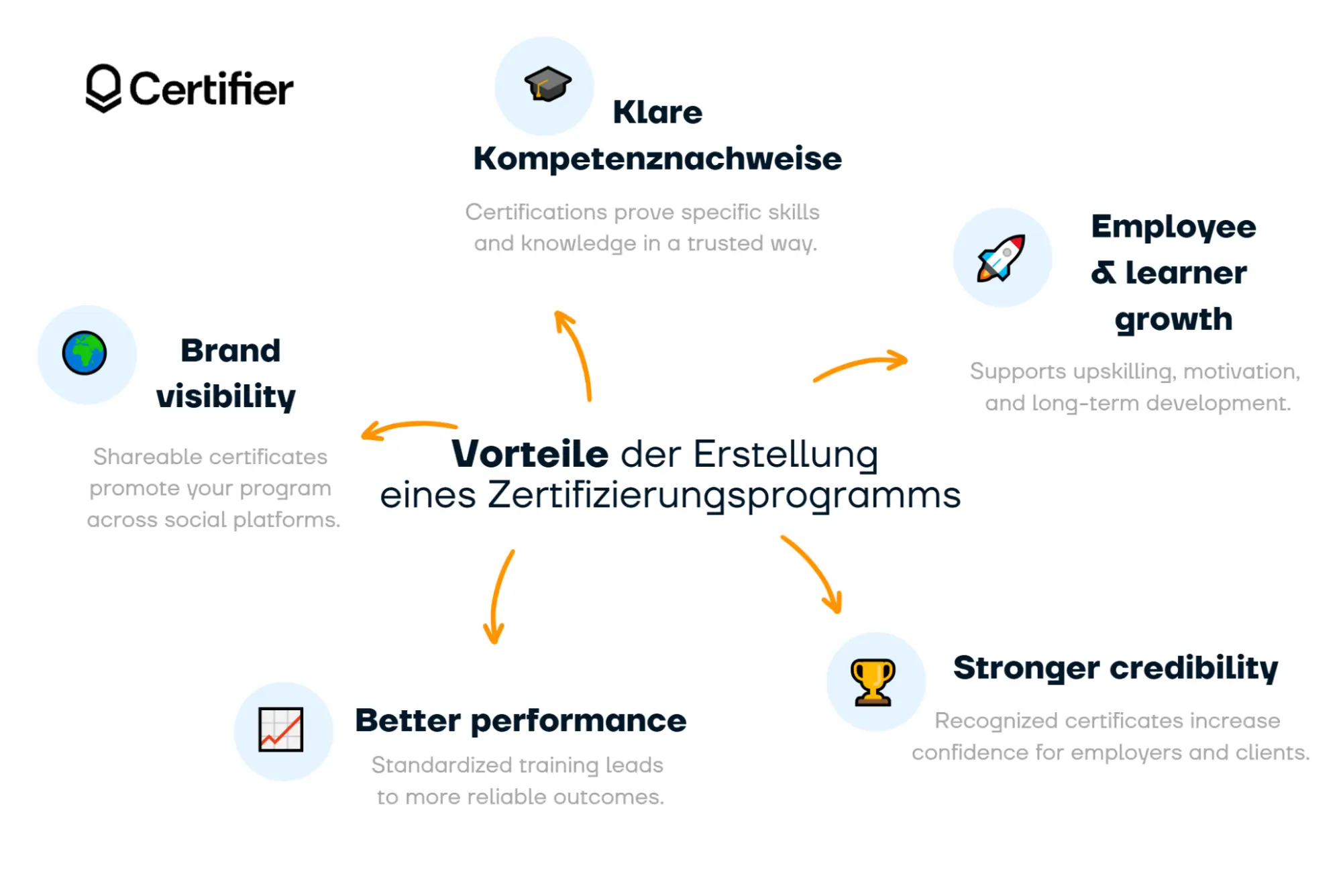 Certifier ist ein leistungsstarker Zertifikat-Generator zur Erstellung digitaler Nachweise – und damit ein idealer Partner für Ihr Zertifizierungsprogramm. Es ist eine Win-win-Situation: Ihre Marke wird gestärkt und die Teilnehmenden erhalten eine hochwertige Anerkennung für ihren Einsatz und ihre investierte Zeit.
