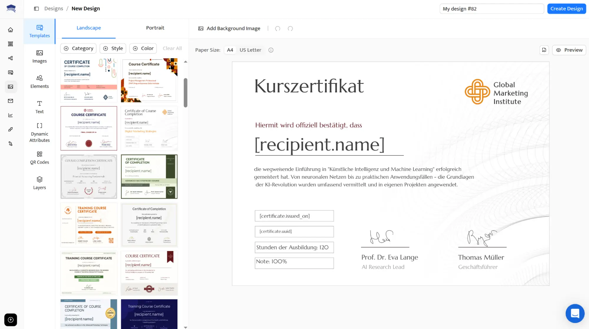 Wählen Sie einfach das editierbare Design aus, das zu Ihrem Branding und Ihrem Zertifizierungsprogramm passt, und personalisieren Sie es mit wenigen Klicks: Logo hochladen, Farben anpassen, Texte einfügen – dank Drag-and-Drop-Editor ist alles intuitiv bedienbar.