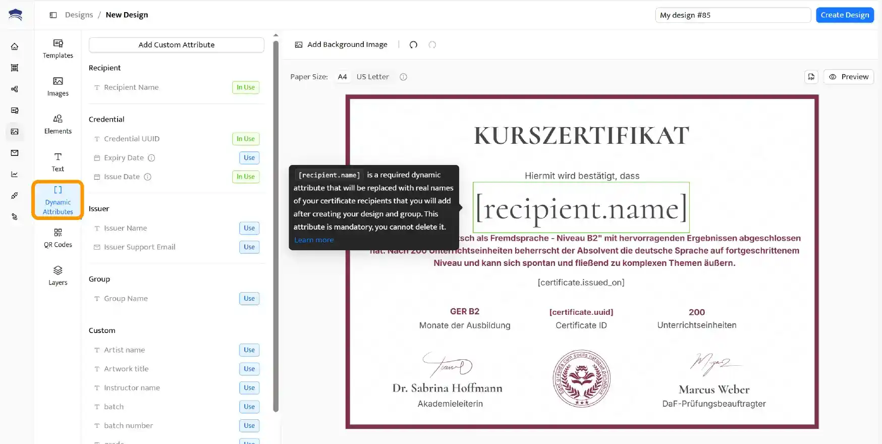 Mit dynamischen Attributen automatisiert Certifier die Erstellung personalisierter Zertifikate – ganz ohne manuelle Nachbearbeitung.