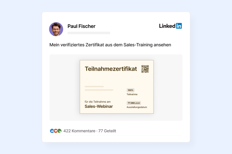 Steigern Sie die Sichtbarkeit Ihrer Webinare mit teilbaren Zertifikaten – bereit zum Posten auf LinkedIn, inklusive Branding und Hashtags.