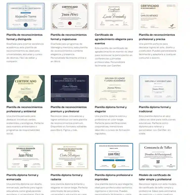 Son especialmente útiles cuando necesitas emitir certificados a gran escala, ya que eliminan el trabajo repetitivo sin perder consistencia visual.