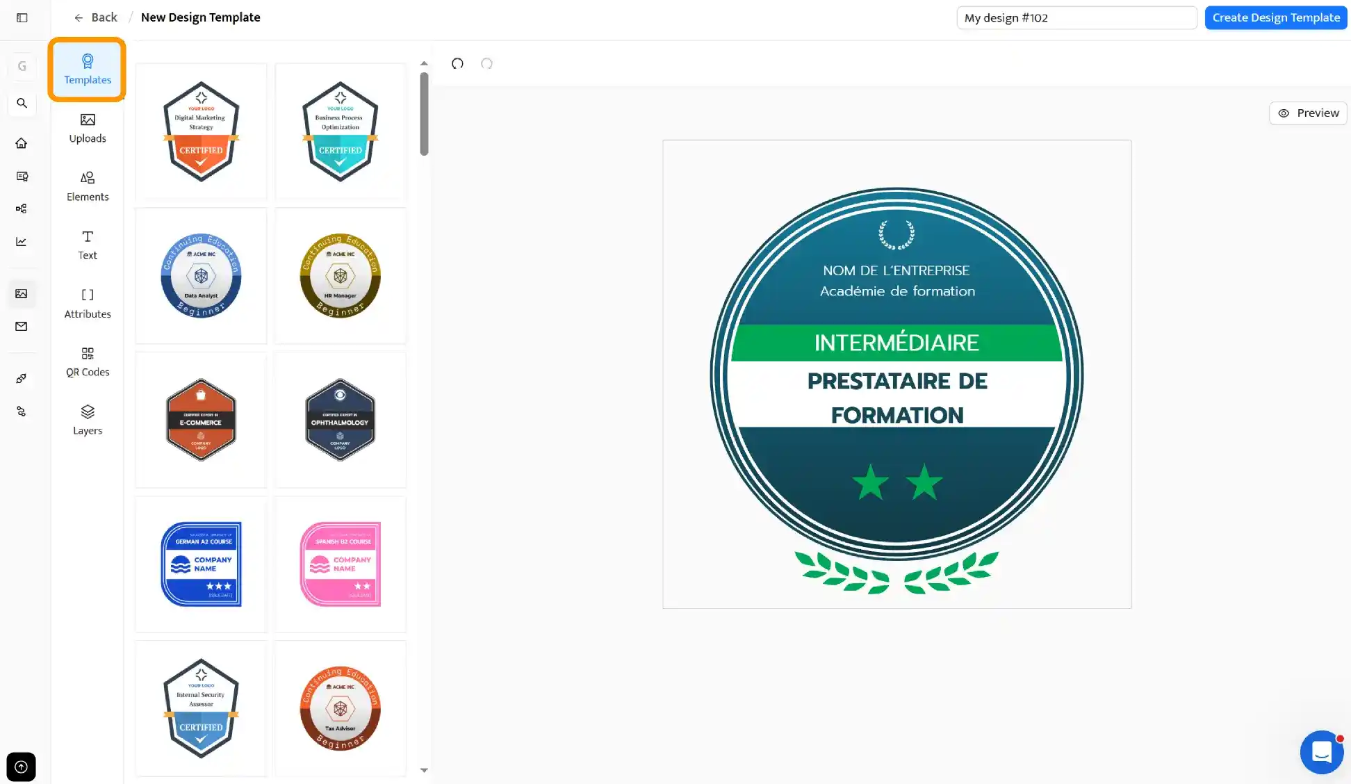 Nuestro editor funciona como cualquier creador estándar. La mayoría de los usuarios prefieren ir directamente a la pestaña Templates y elegir plantillas de insignias digitales prediseñadas creadas profesionalmente.