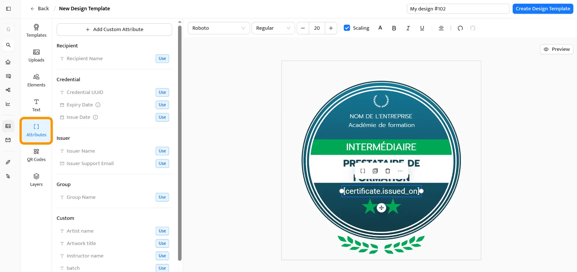 Segundo paso: Ajusta el diseño de la insignia e incluye atributos dinámicos en el creador de insignias.