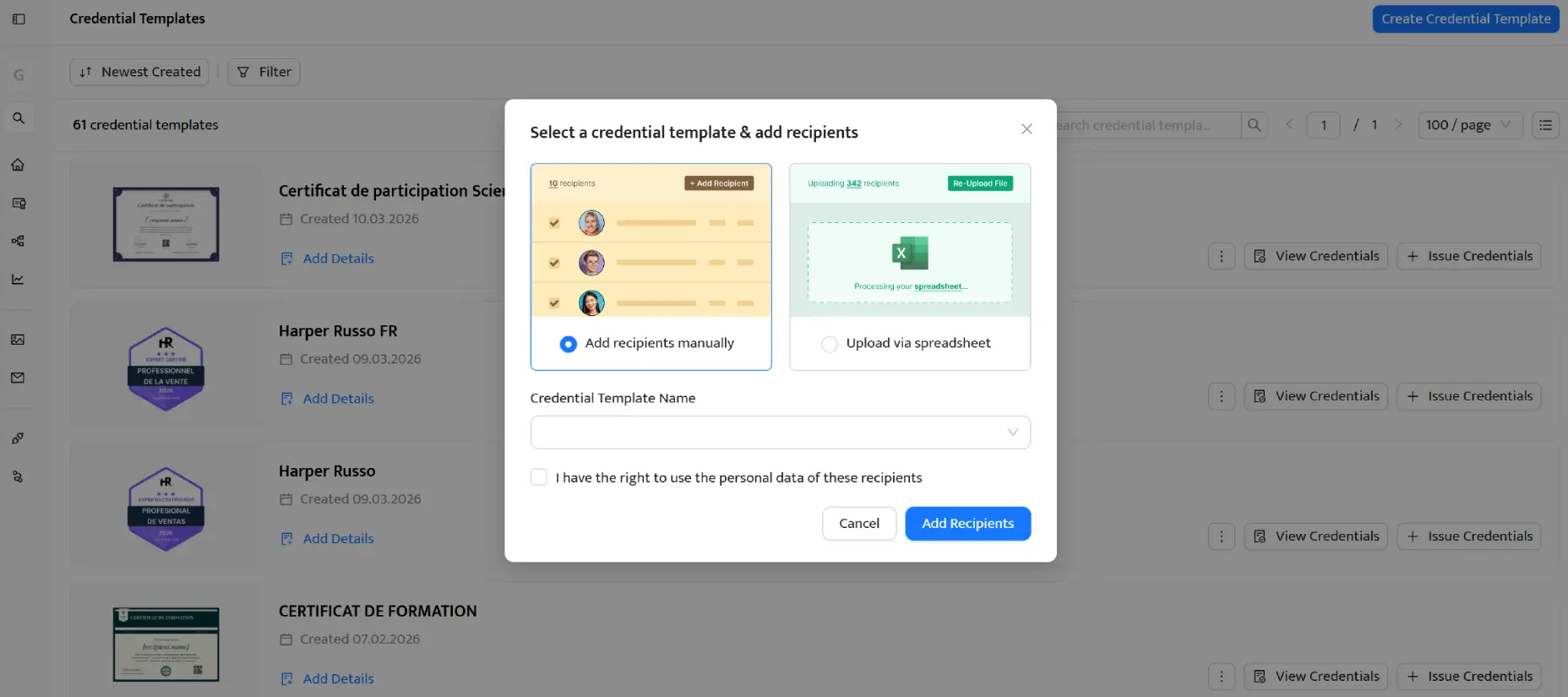 Los datos de la columna Recipient Name reemplazarán el atributo [recipient.name], y los correos de Recipient Email se usarán para enviar las insignias en masa. Una vez subida la hoja de cálculo, mapea las columnas con los atributos de Certifier.