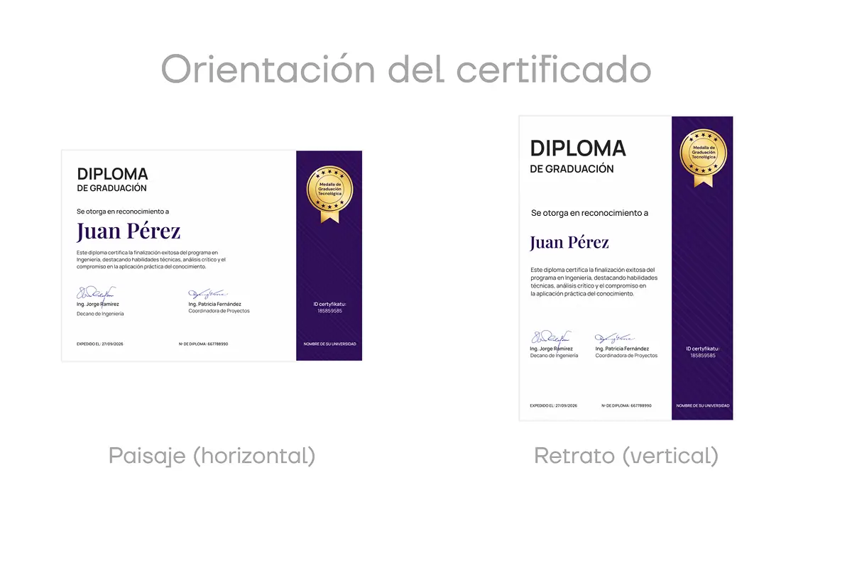 La orientación horizontal puede funcionar mejor para certificados digitales que se visualizarán en pantalla, mientras que la vertical suele ser más adecuada para certificados impresos.