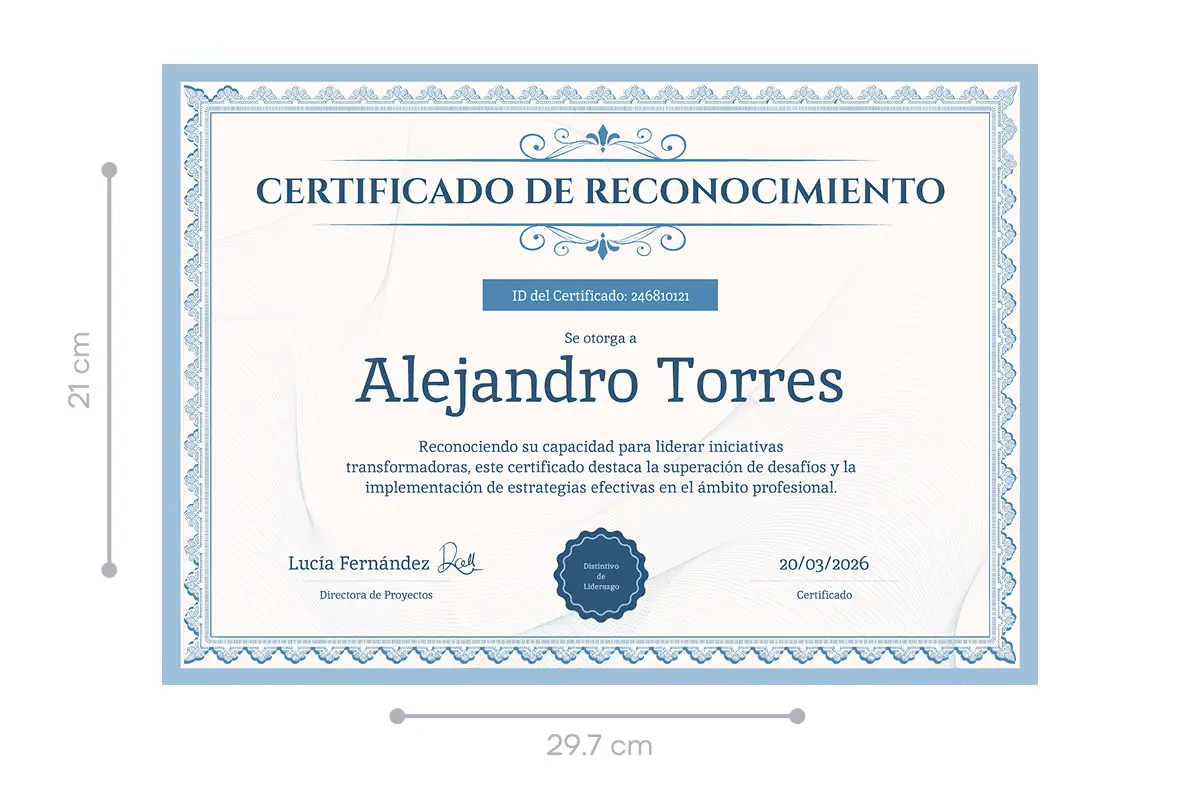 El tamaño del certificado, junto con el formato de papel estándar, es clave para garantizar un resultado profesional y mantener tu imagen como emisor serio y confiable.
