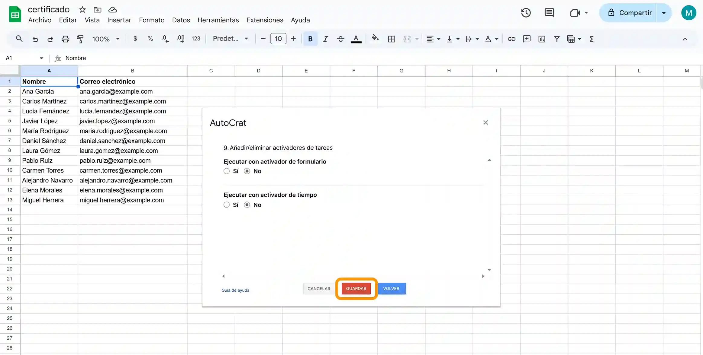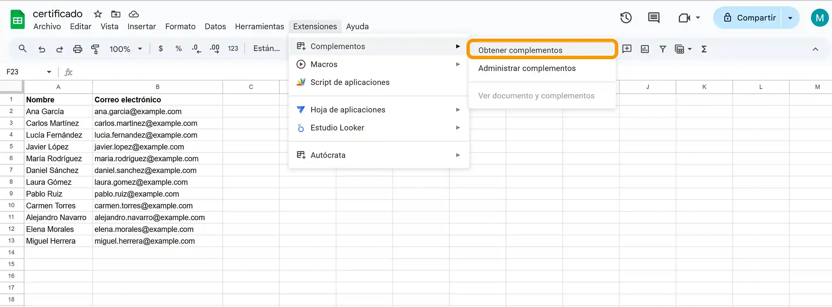 Una vez que tengas el diseño del certificado listo, crea una hoja de cálculo de Google con todos los datos de los destinatarios. Para automatizar el proceso de envío de certificados de empresa, necesitarás instalar un complemento llamado AutoCrat.
