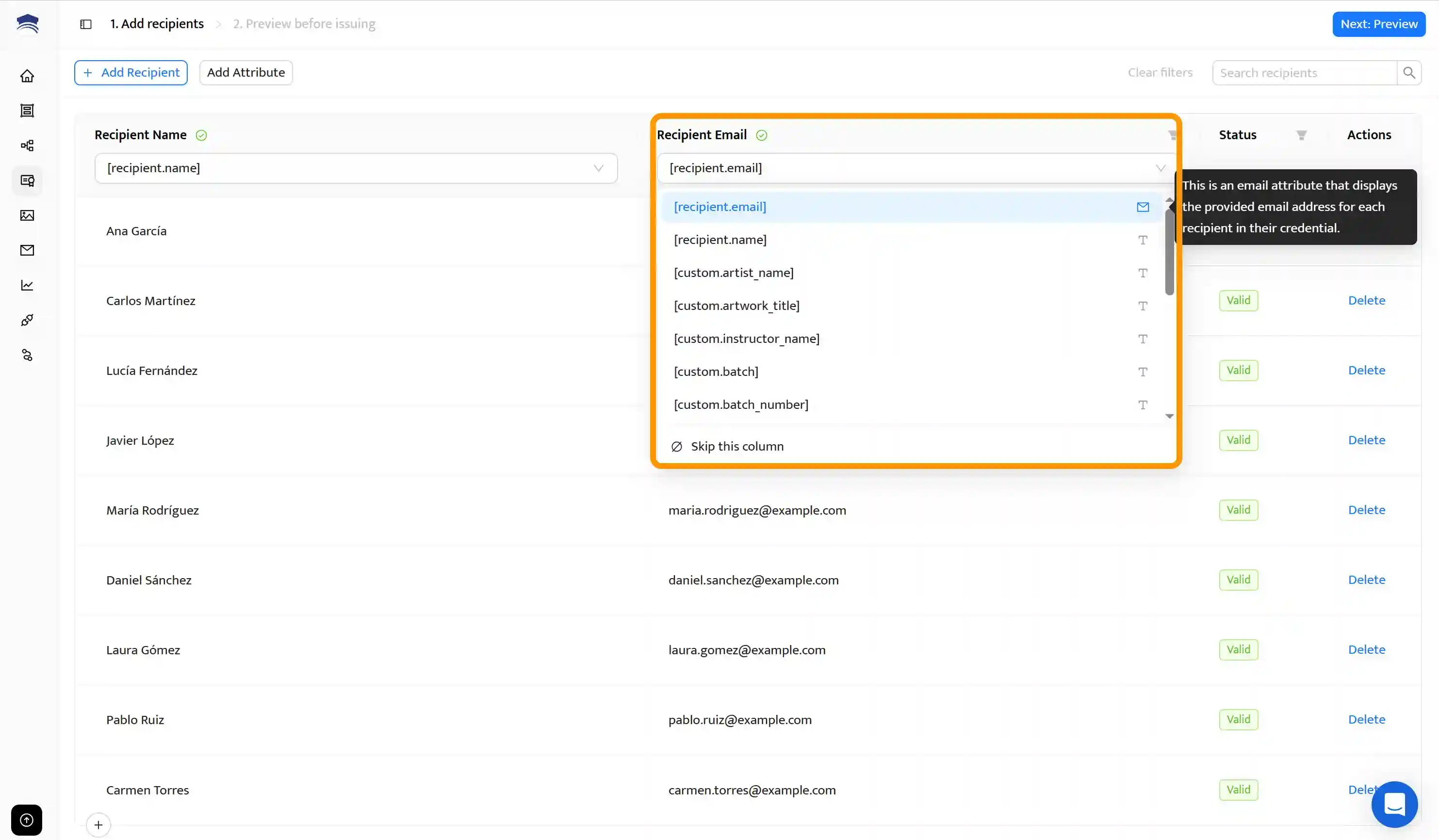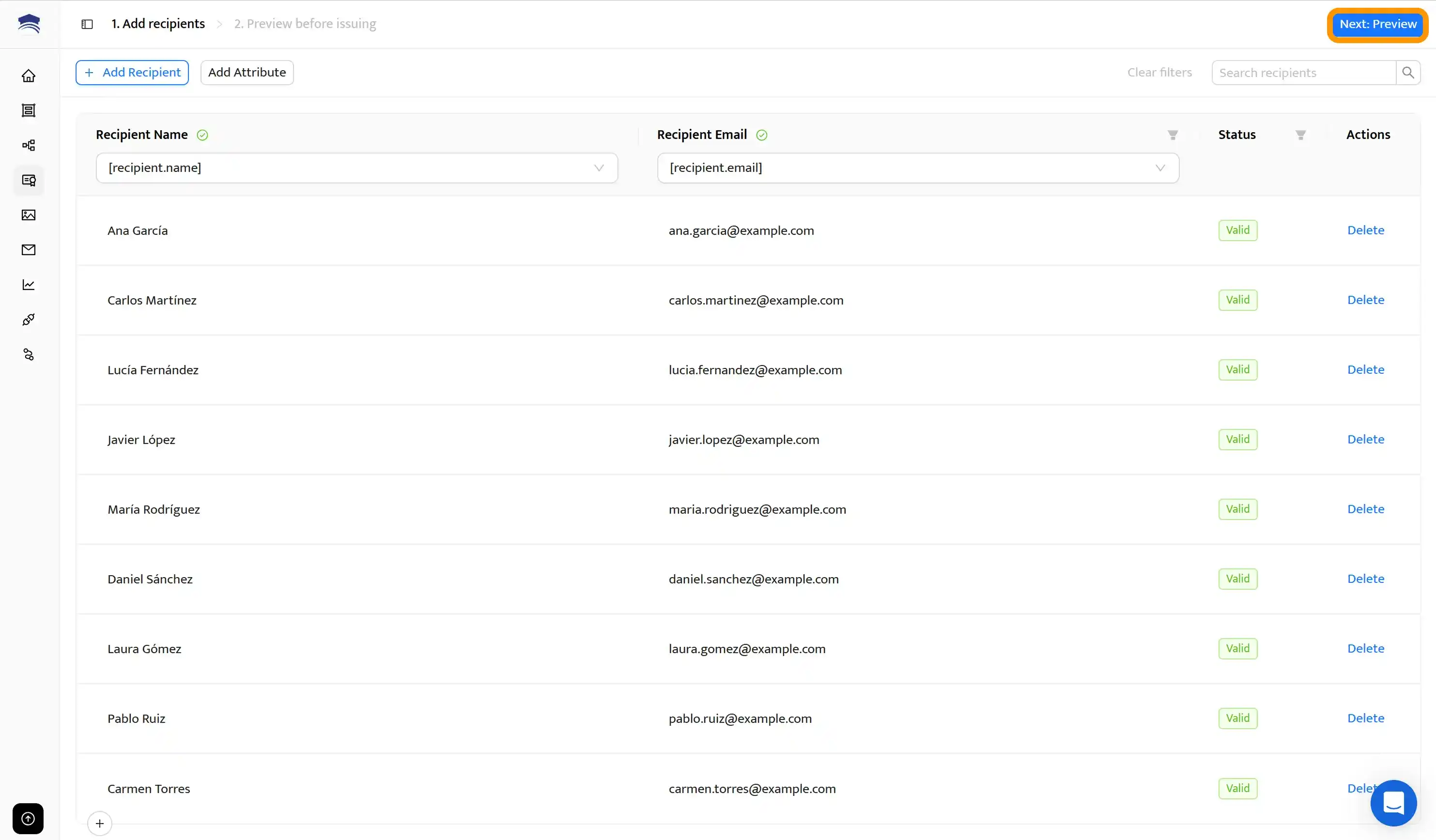 Certifier verificará que hayas proporcionado toda la información necesaria para emitir y enviar los certificados digitales por correo electrónico. Luego, haz clic en Next: Preview en la esquina superior derecha para comprobar que todos los certificados se han generado correctamente, sin errores.
