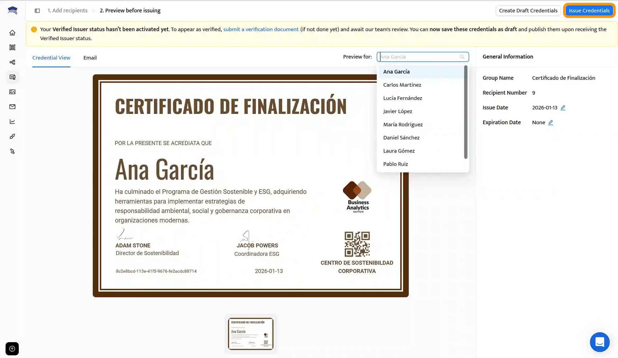 Después de eso, haz clic en Issue Credentials para mandar certificado digital por correo de forma inmediata a todos los destinatarios.