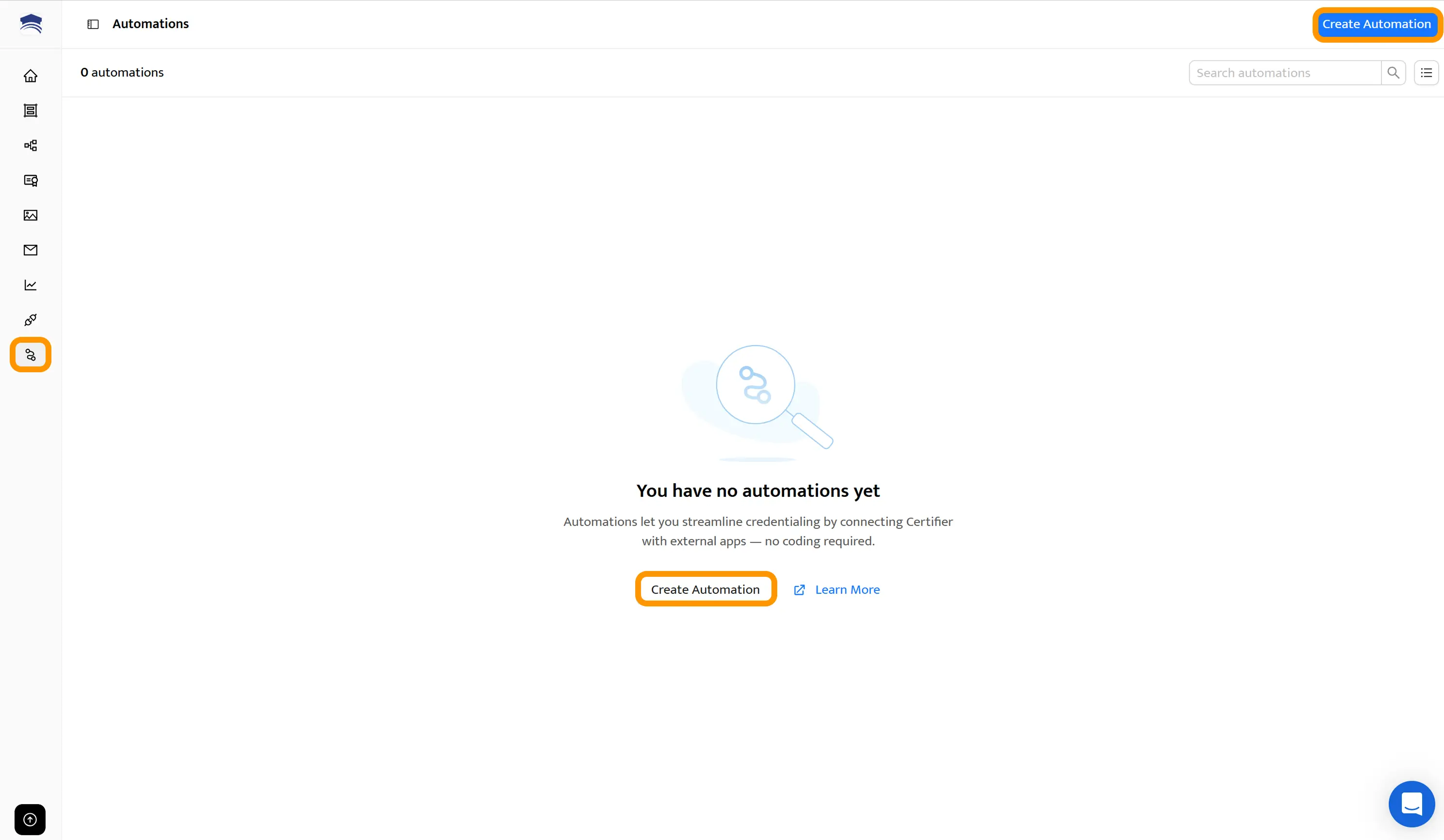 Abre la pestaña Automations en tu cuenta de Certifier.