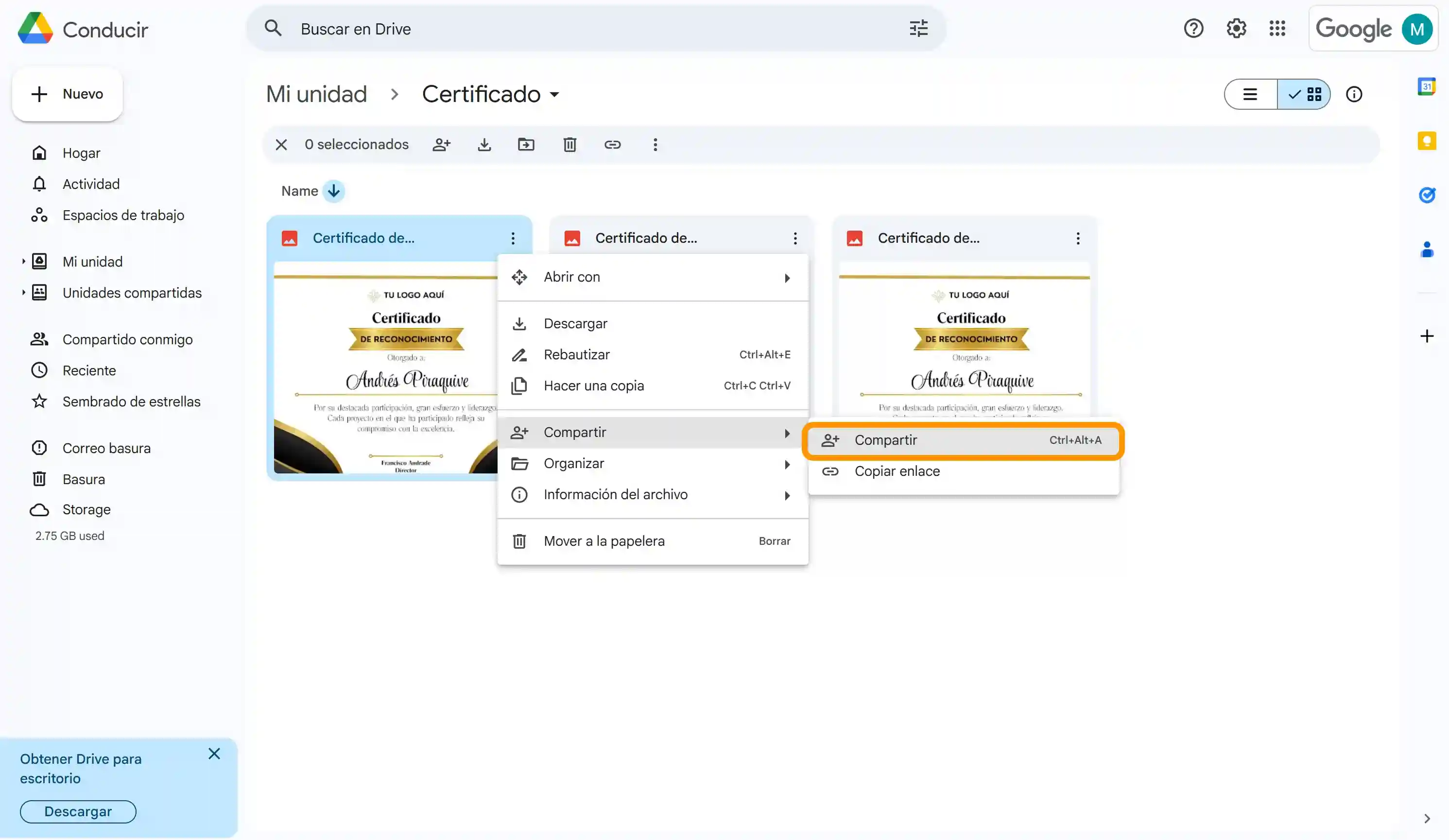 Primero, crea una carpeta específica en Google Drive donde se almacenarán todos los certificados personalizados. Esta carpeta funcionará como un espacio centralizado para gestionar y compartir certificados digitales por email, facilitando el acceso y la organización de los archivos.