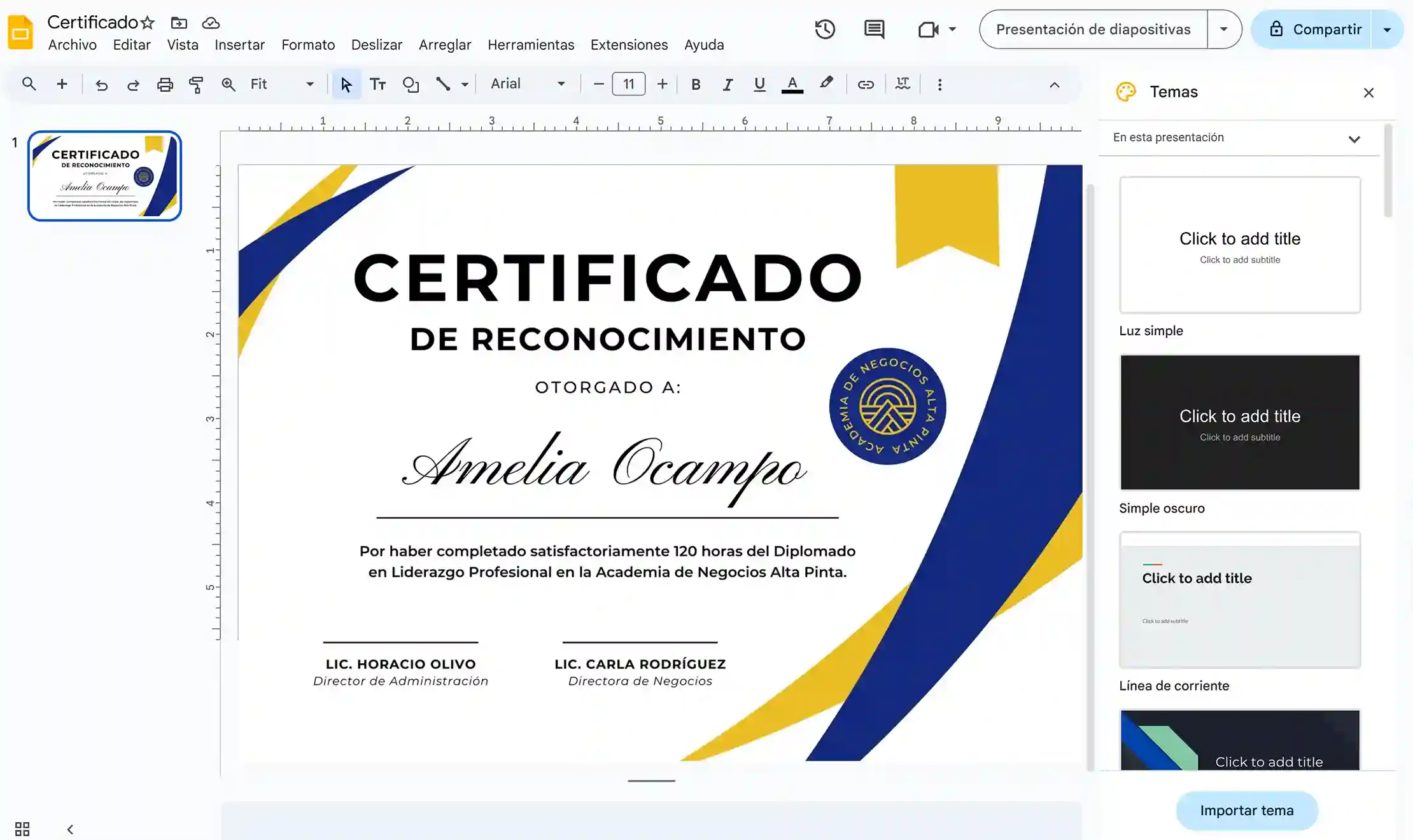 Selecciona la plantilla del certificado desde Google Slides.