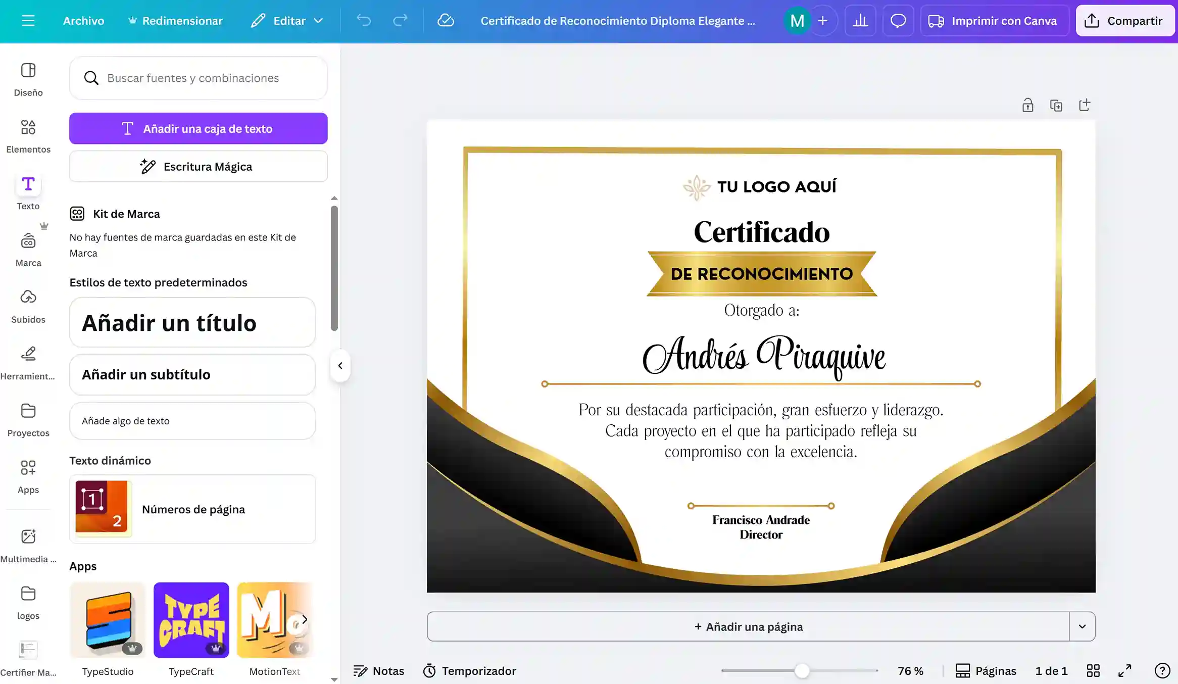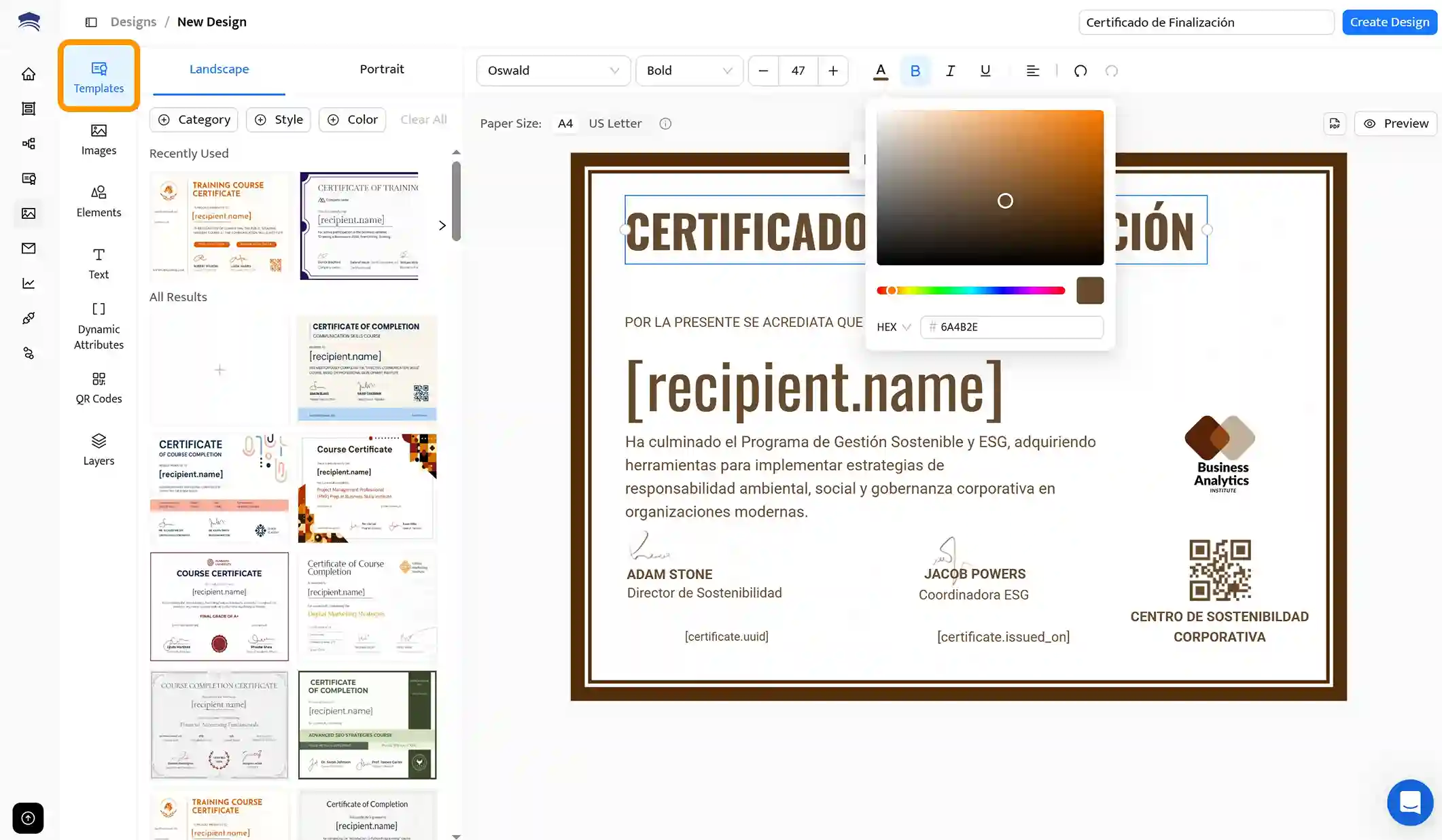 Ten en cuenta que aquí tendrás que introducir los datos de los destinatarios de forma manual, lo cual puede resultar tedioso si son muchos. Sin embargo, una ventaja de usar Canva es la gran variedad de plantillas de certificados disponibles.