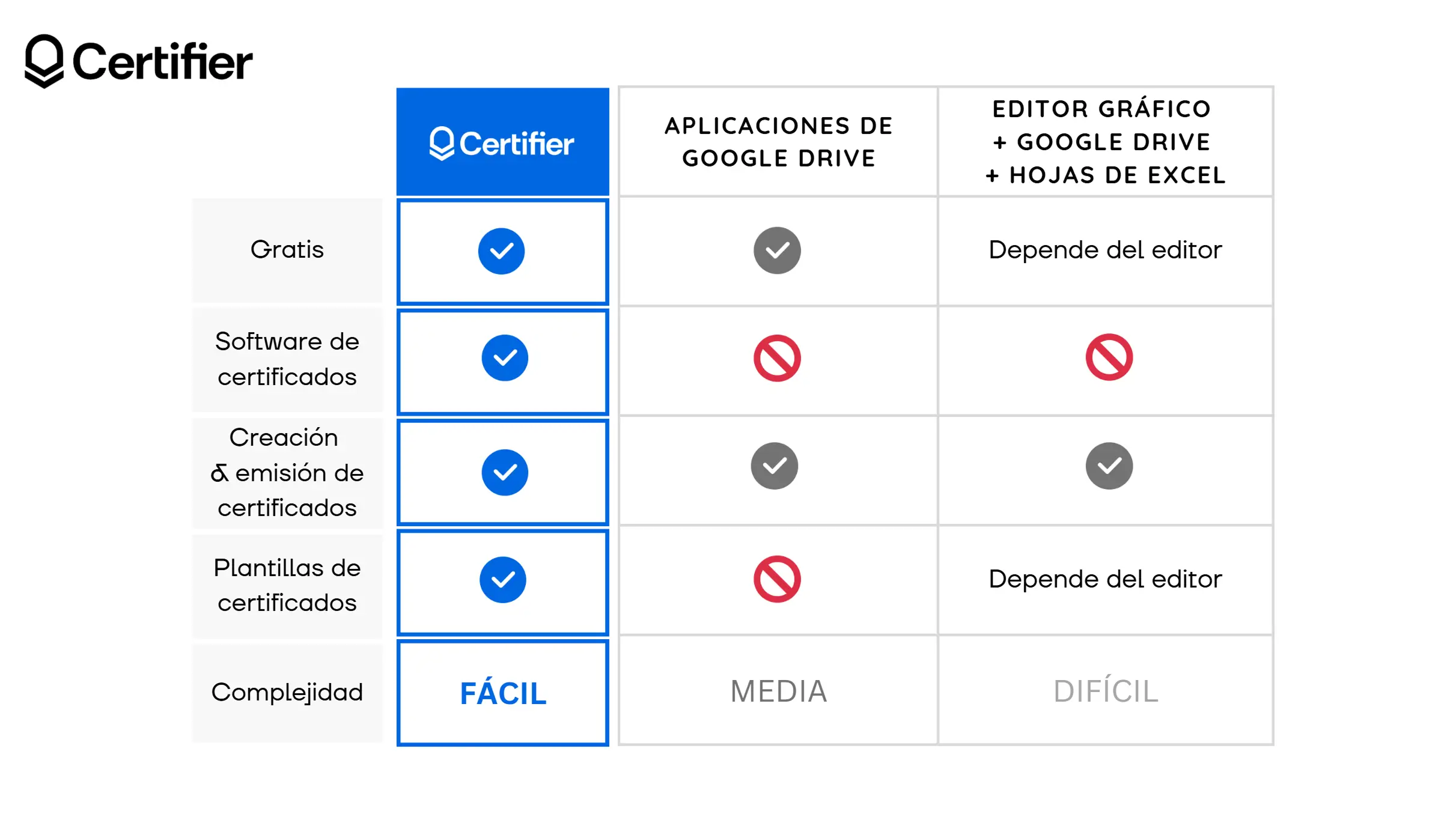 Consulta esta tabla comparativa para conocer cómo se posicionan las distintas opciones. Si buscas cómo enviar certificados en lote, Certifier es la opción más rápida, escalable y sencilla.