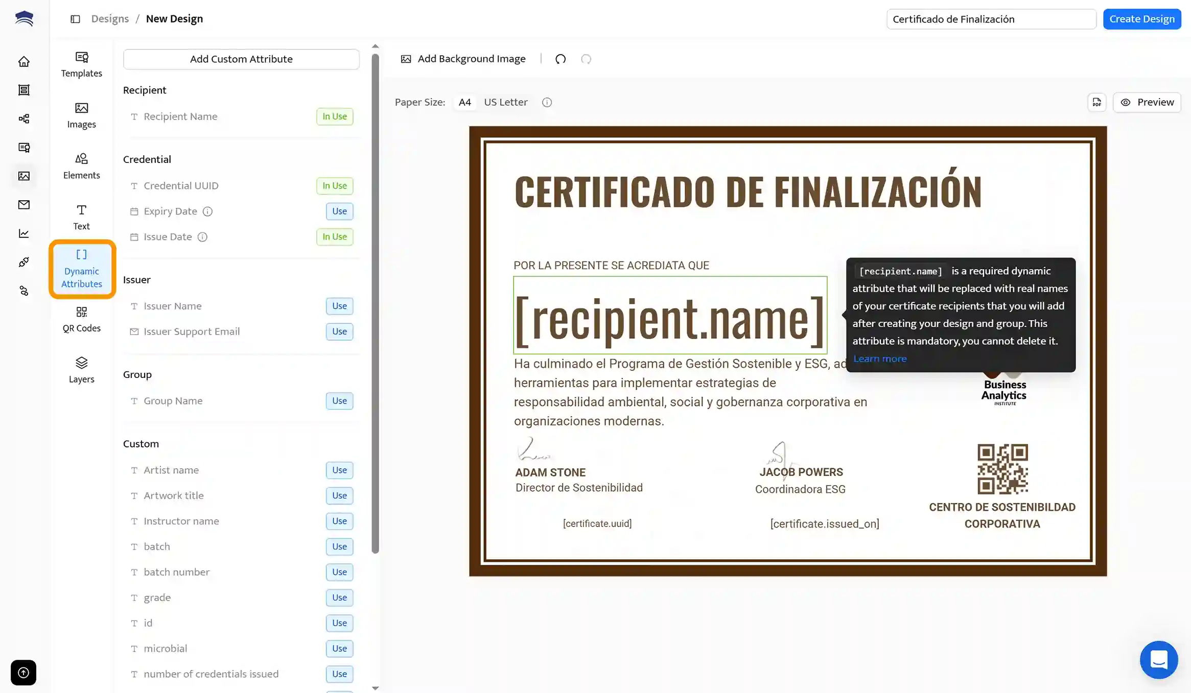No te olvides de los atributos dinámicos como el nombre del destinatario: son fundamentales para generar certificados digitales en masa y enviar certificado digital por email de forma automática a cada persona.