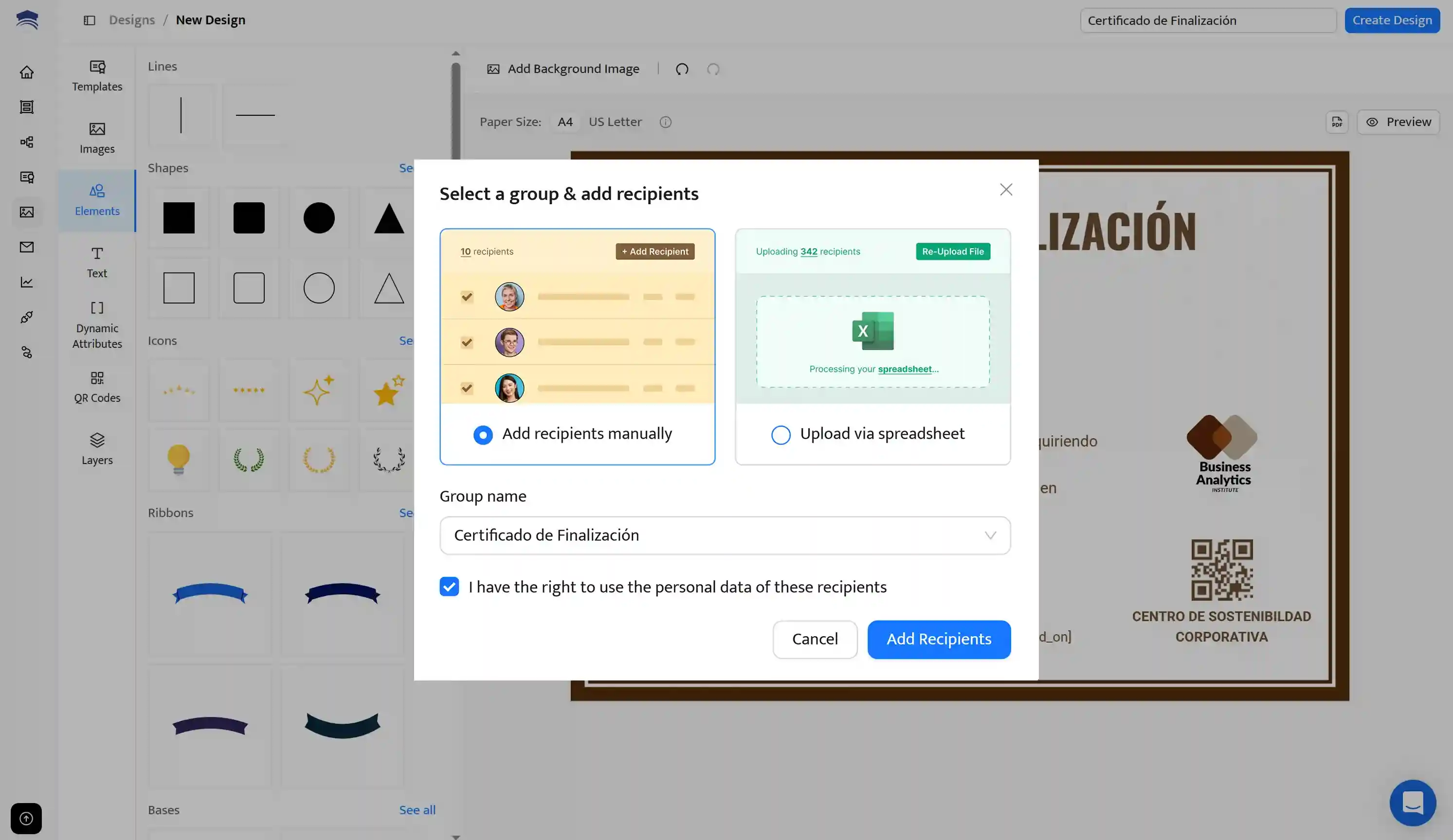 Una vez que hagas clic en Save para generar tu primer diseño de certificado, aparecerá una ventana emergente pidiéndote que subas la lista de destinatarios. Solo tienes que seguir las instrucciones; el proceso es muy sencillo.