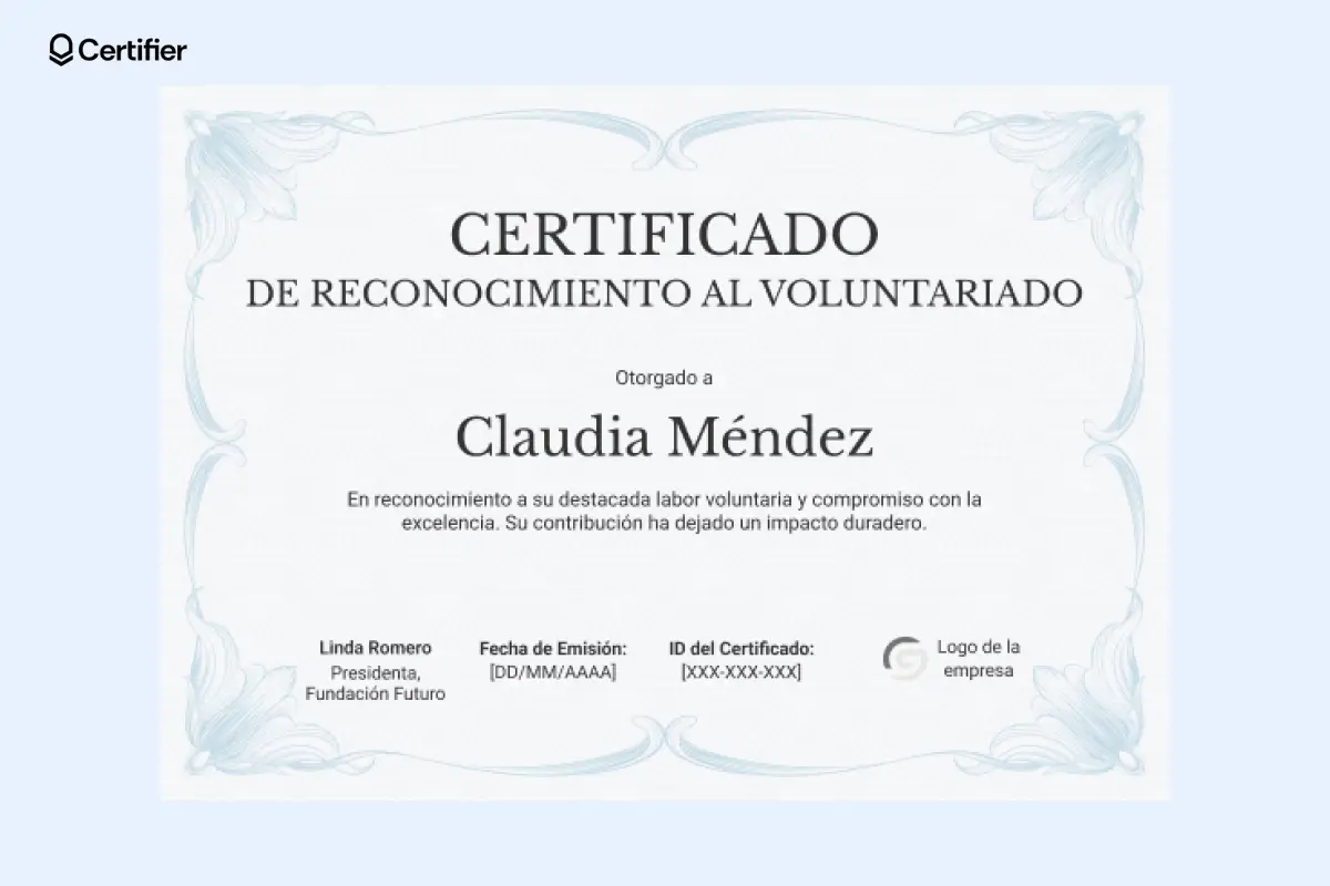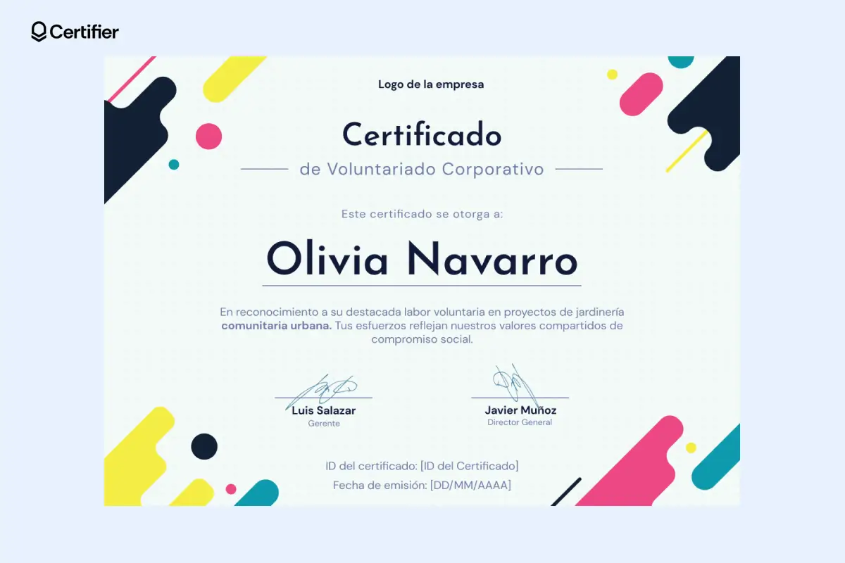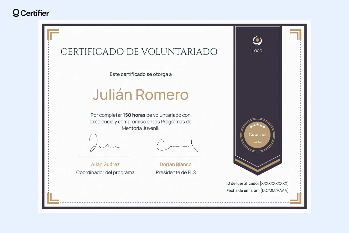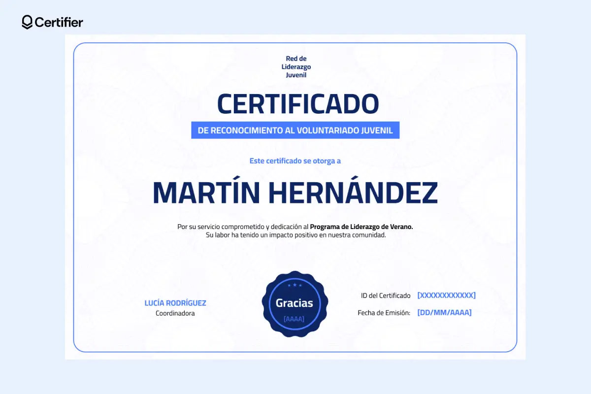 Un modelo de certificado de voluntariado simplifica todo el proceso, ya que permite crear certificados personalizados y profesionales en muy poco tiempo. Certifier, como generador de certificados en bloque, se encarga de ello.