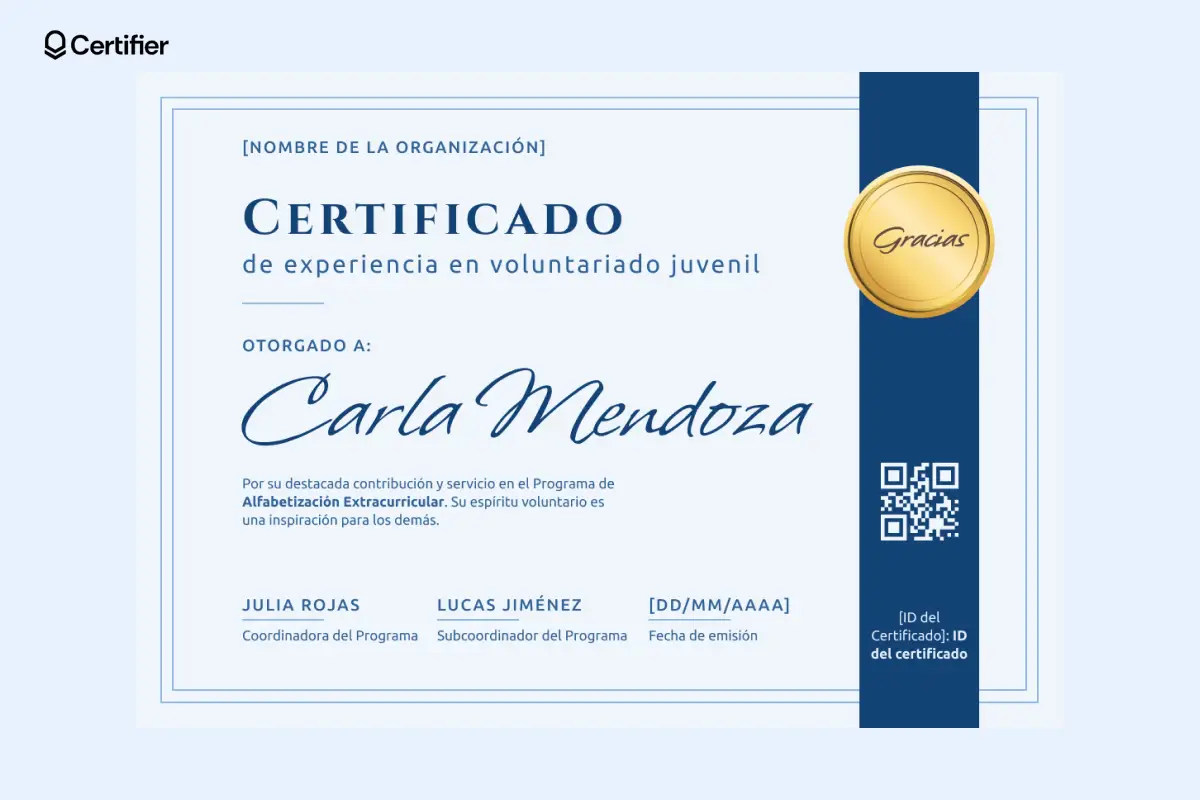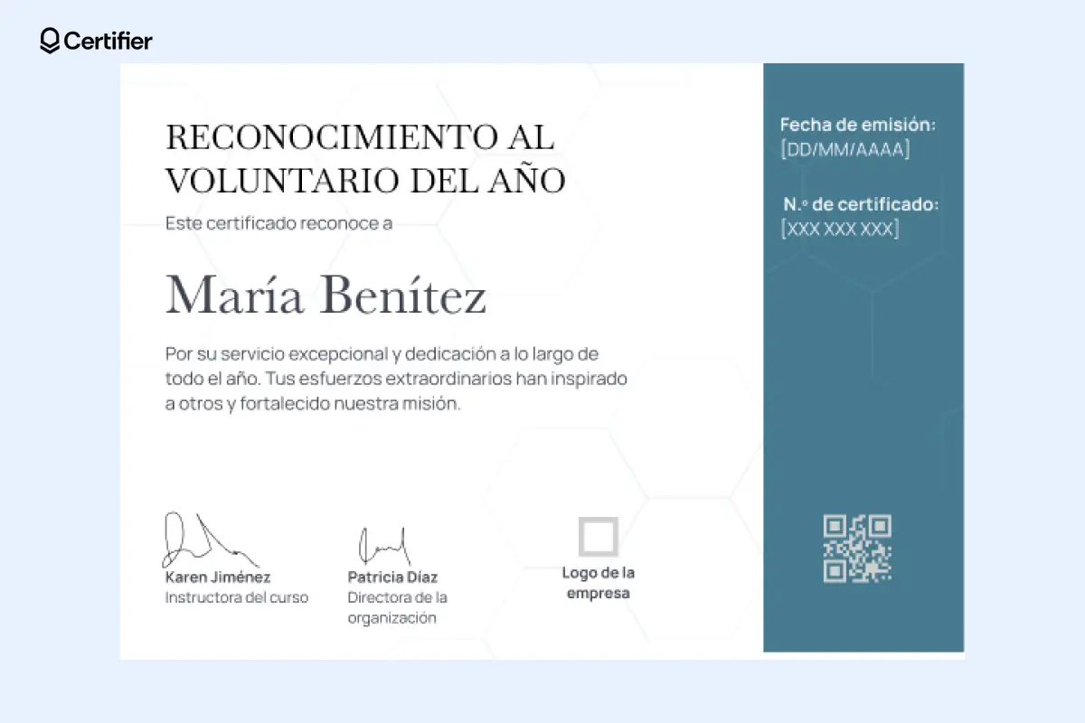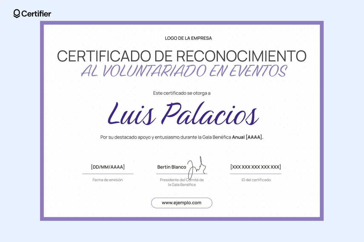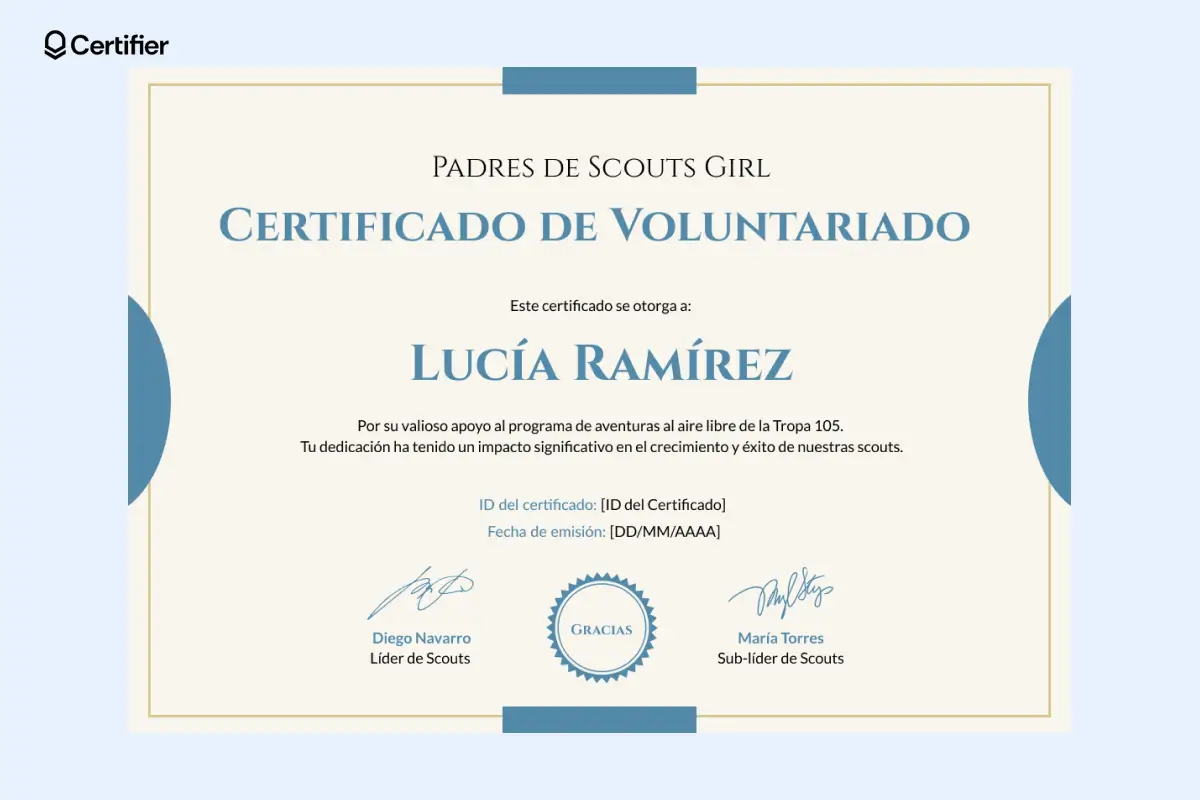 Un modelo de certificado de voluntariado simplifica todo el proceso, ya que permite crear certificados personalizados y profesionales en muy poco tiempo. Certifier, como generador de certificados en bloque, se encarga de ello.