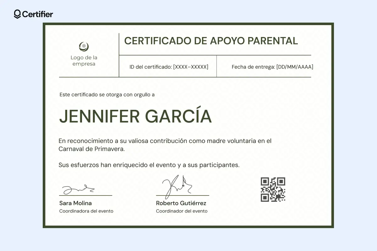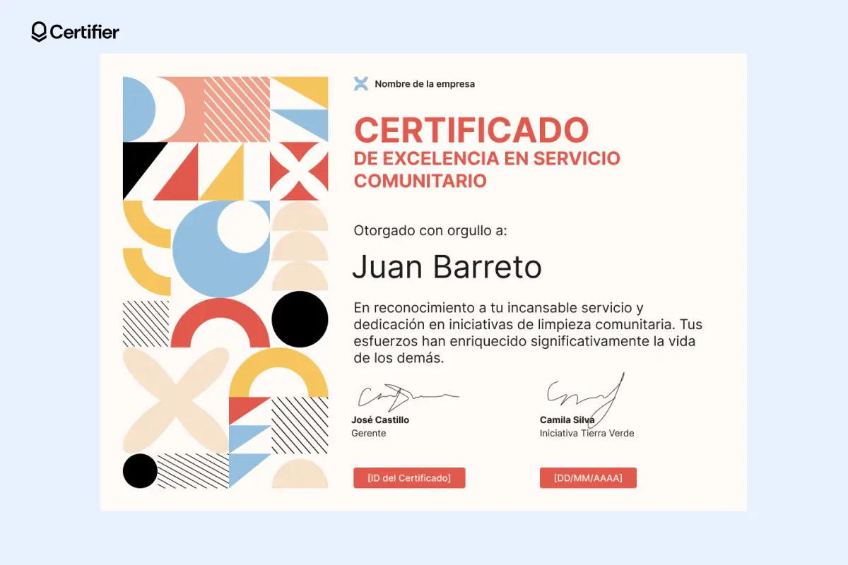 Certifier facilita la adaptación del diseño a tu marca: edita el texto, añade tu logotipo y exporta el certificado en PDF si lo necesitas.