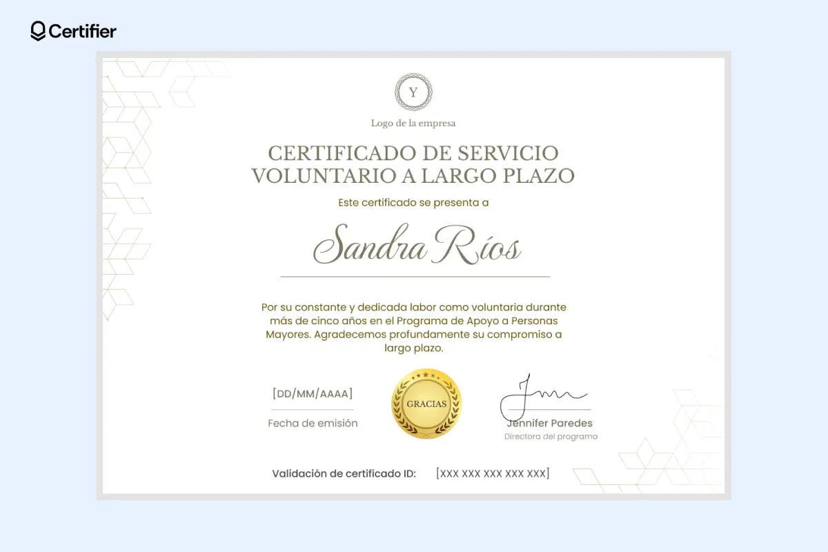 Con sus plantillas fáciles de editar, cada persona voluntaria recibe un reconocimiento claro y bien presentado por su aportación.