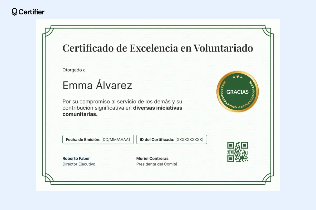 Ya sea un certificado por trabajo voluntario o un certificado de voluntariado en PDF más formal, Certifier garantiza que cada documento sea único.