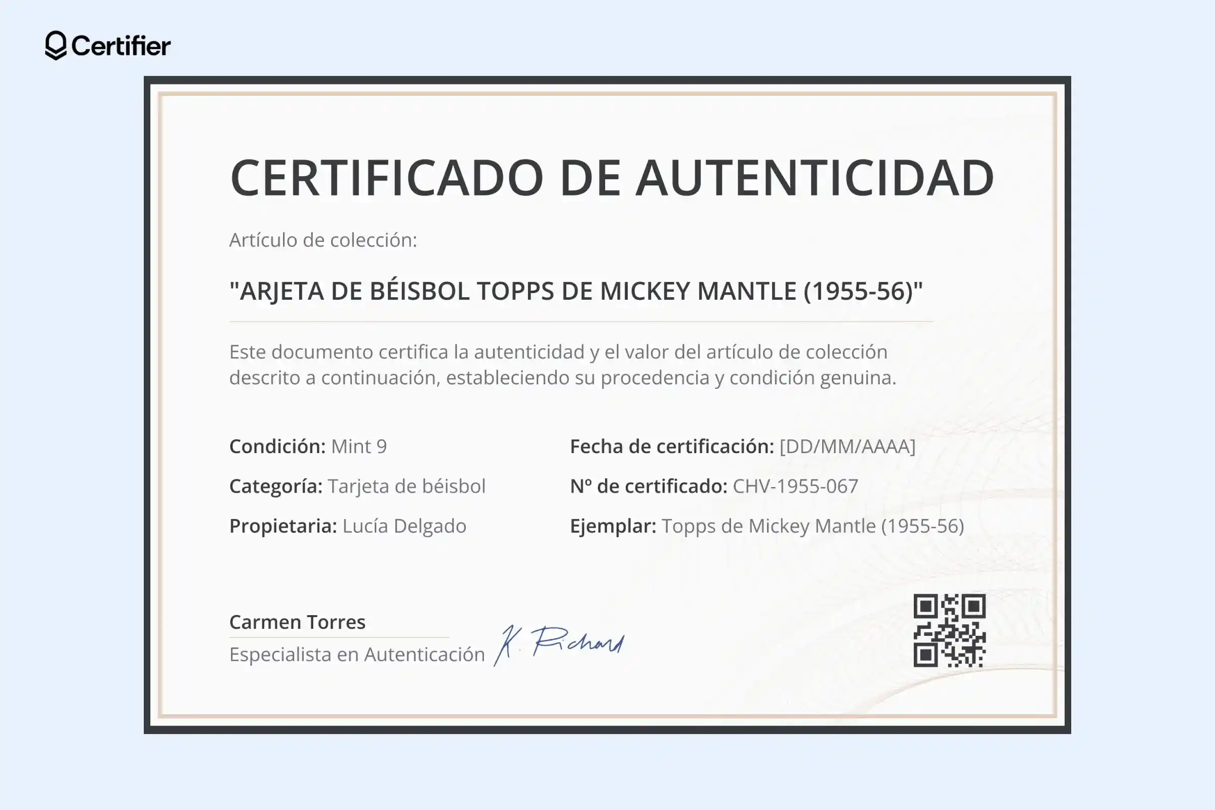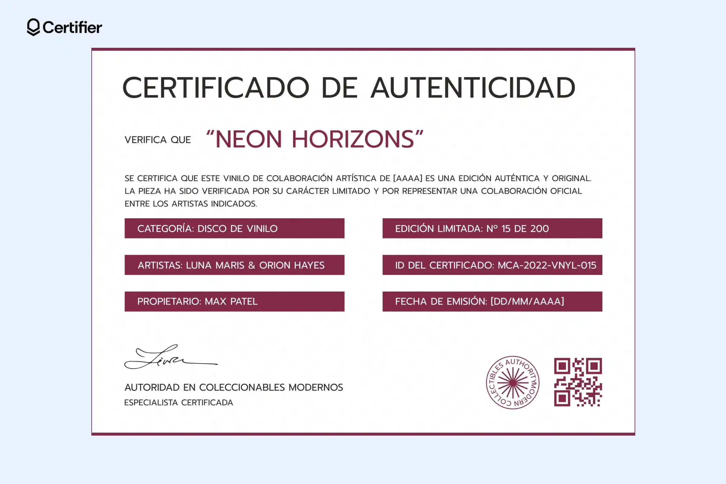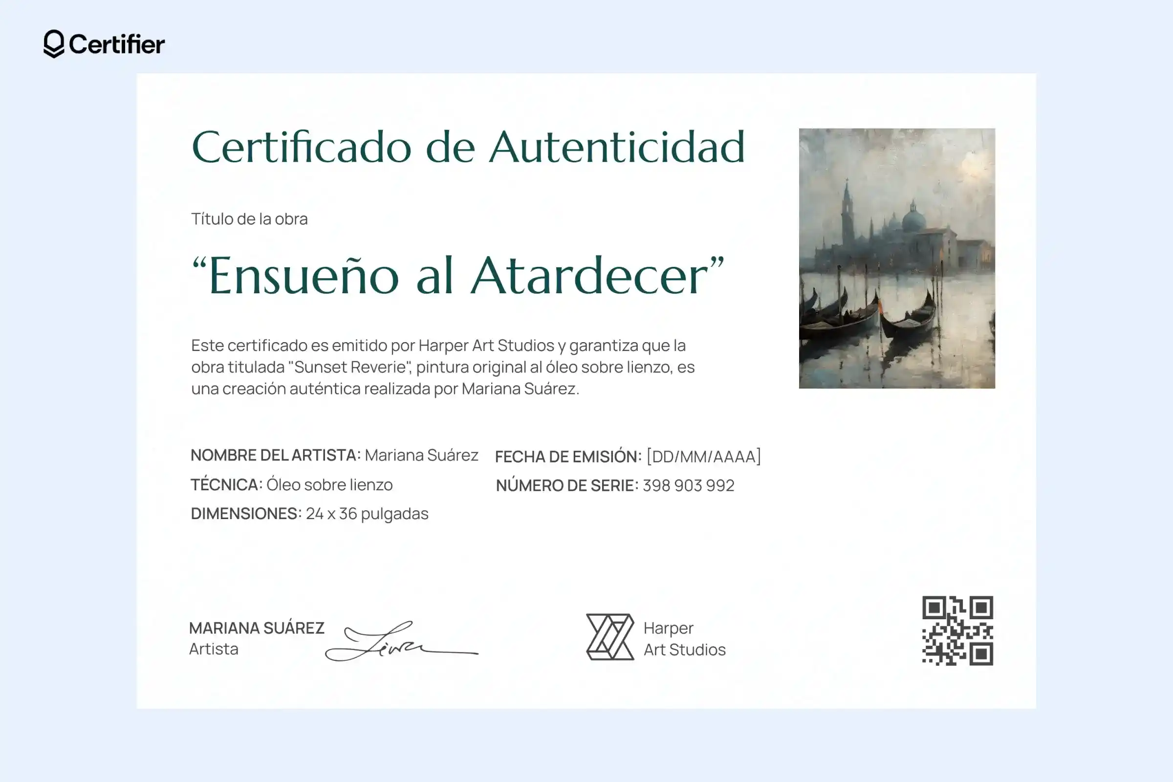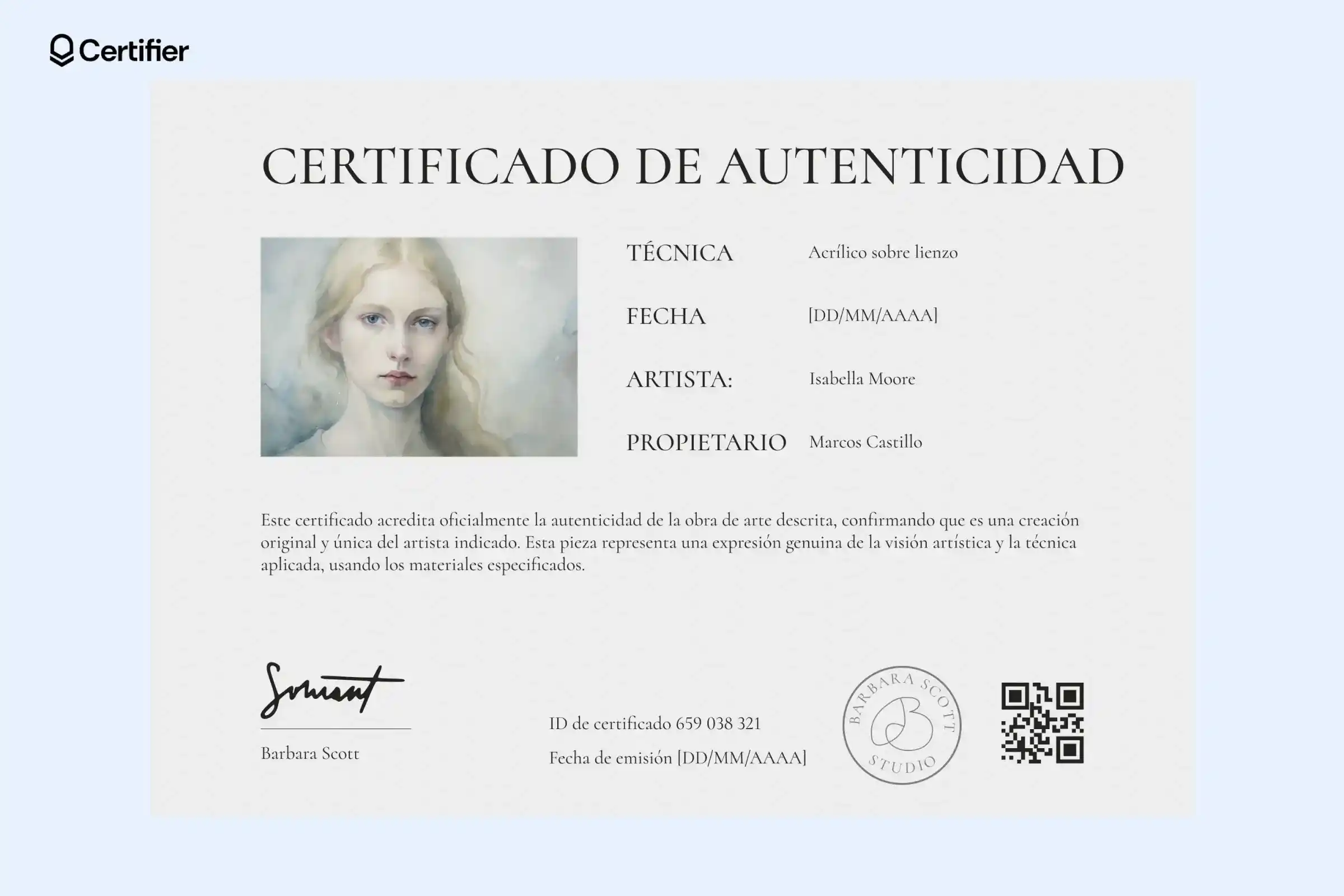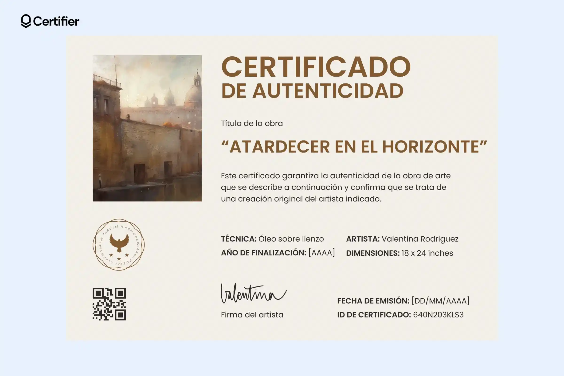 Tiene espacio para el título de la obra, nombre del artista, técnica, fecha de impresión, propietario y una imagen central. Además, puedes añadir un código QR para validar la autenticidad en segundos.