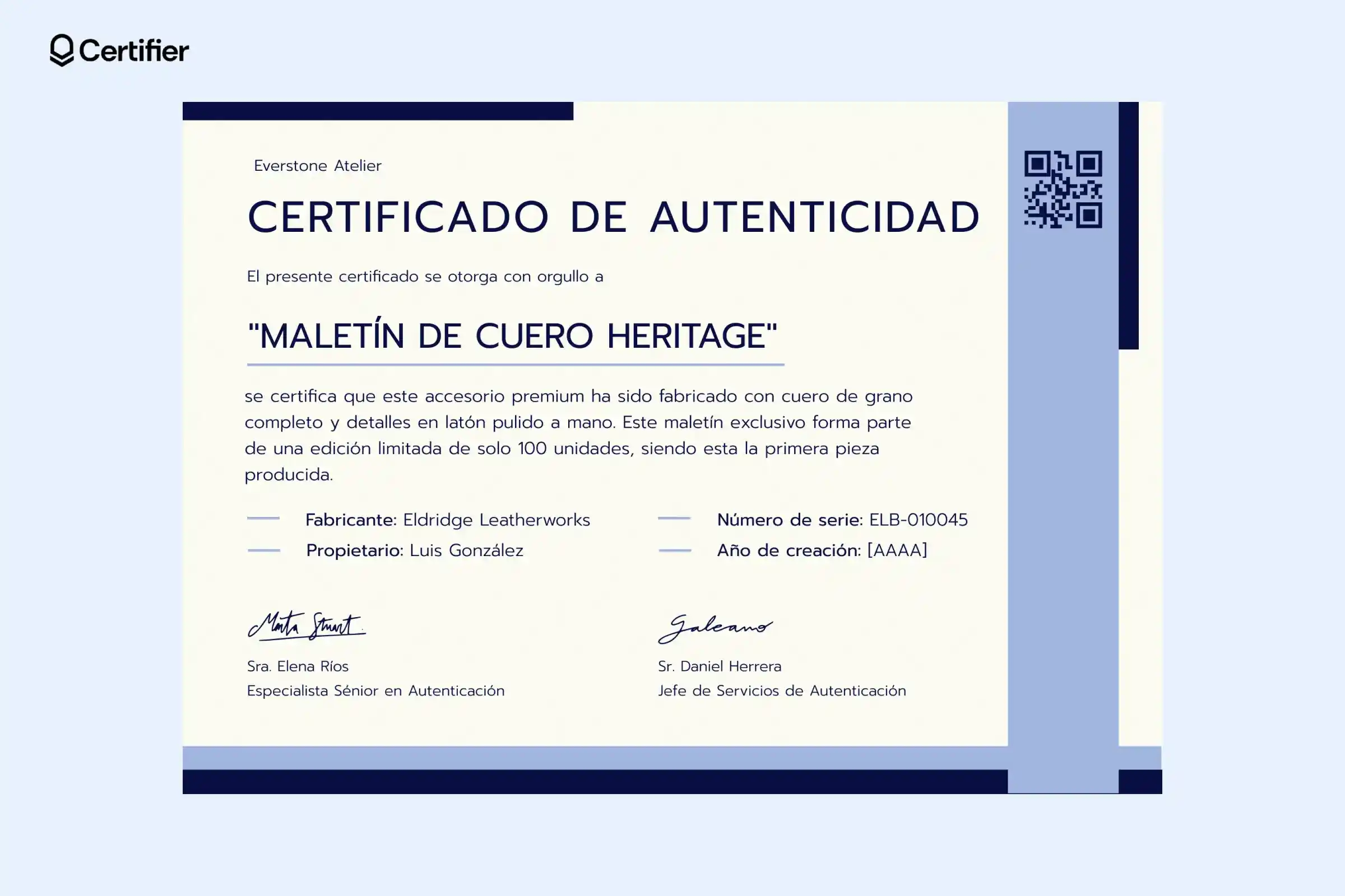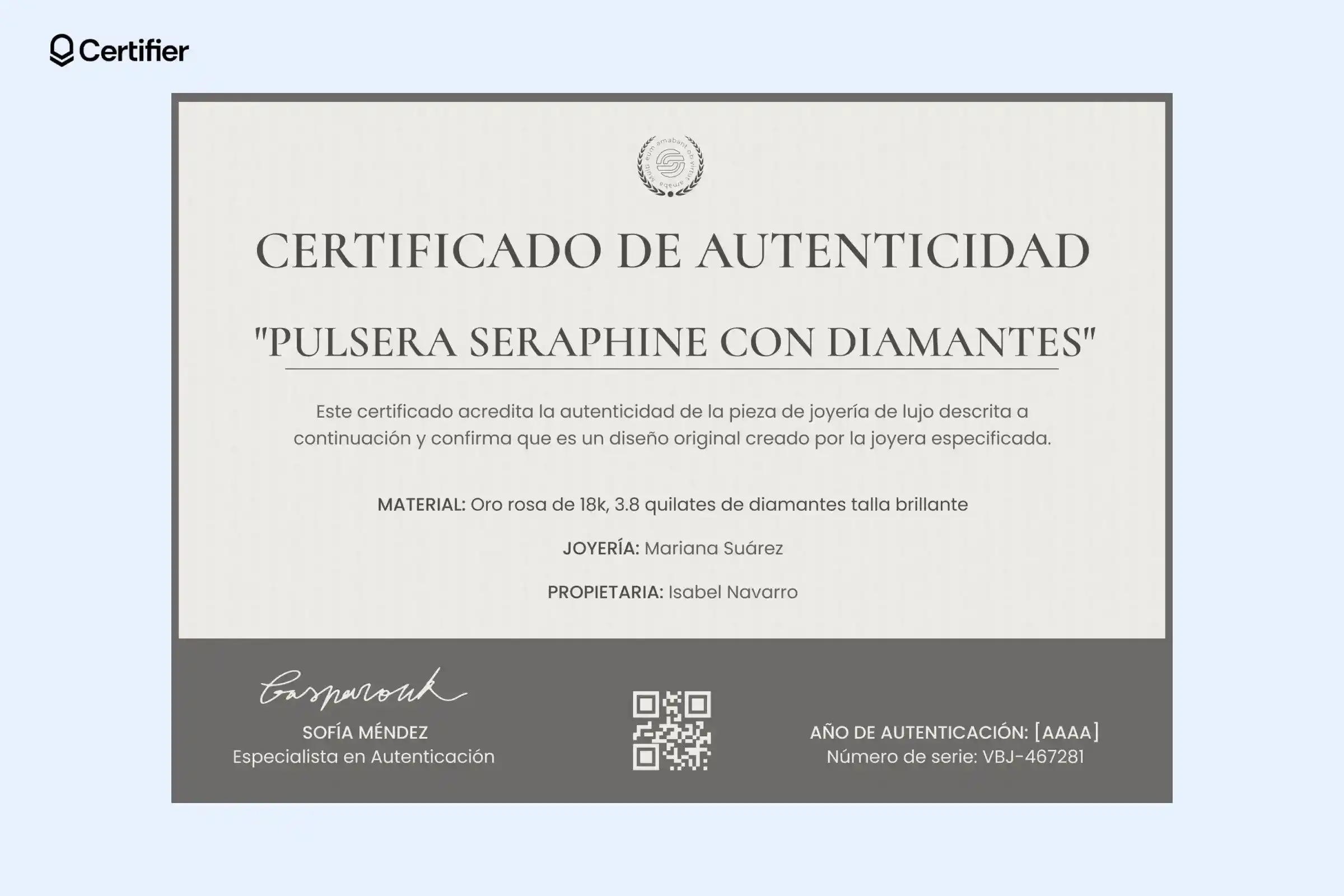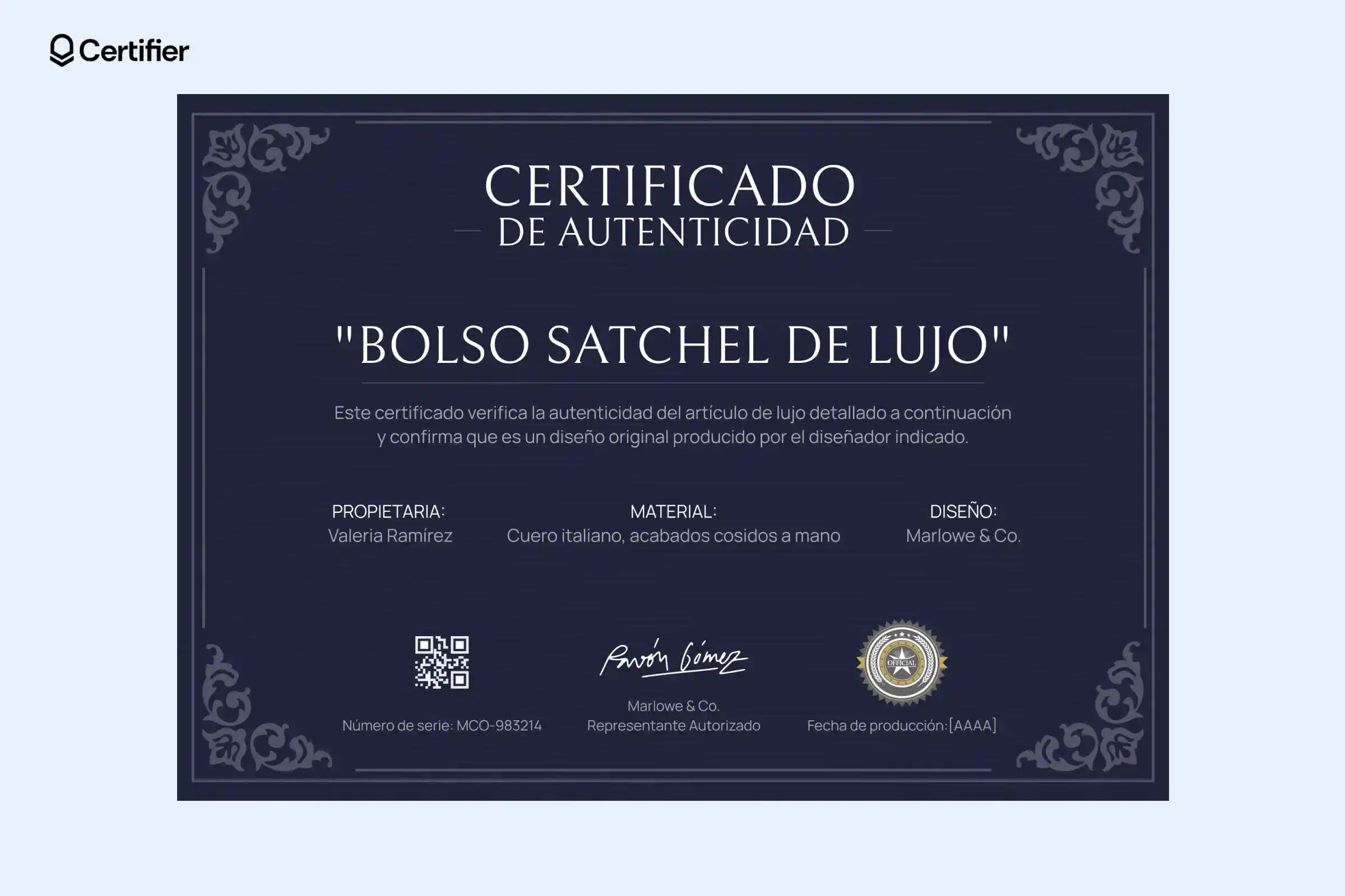 Este ejemplo profesional de certificado de autenticidad de un producto es ideal para certificar artículos de lujo como bolsos de diseñador, joyería o piezas exclusivas.