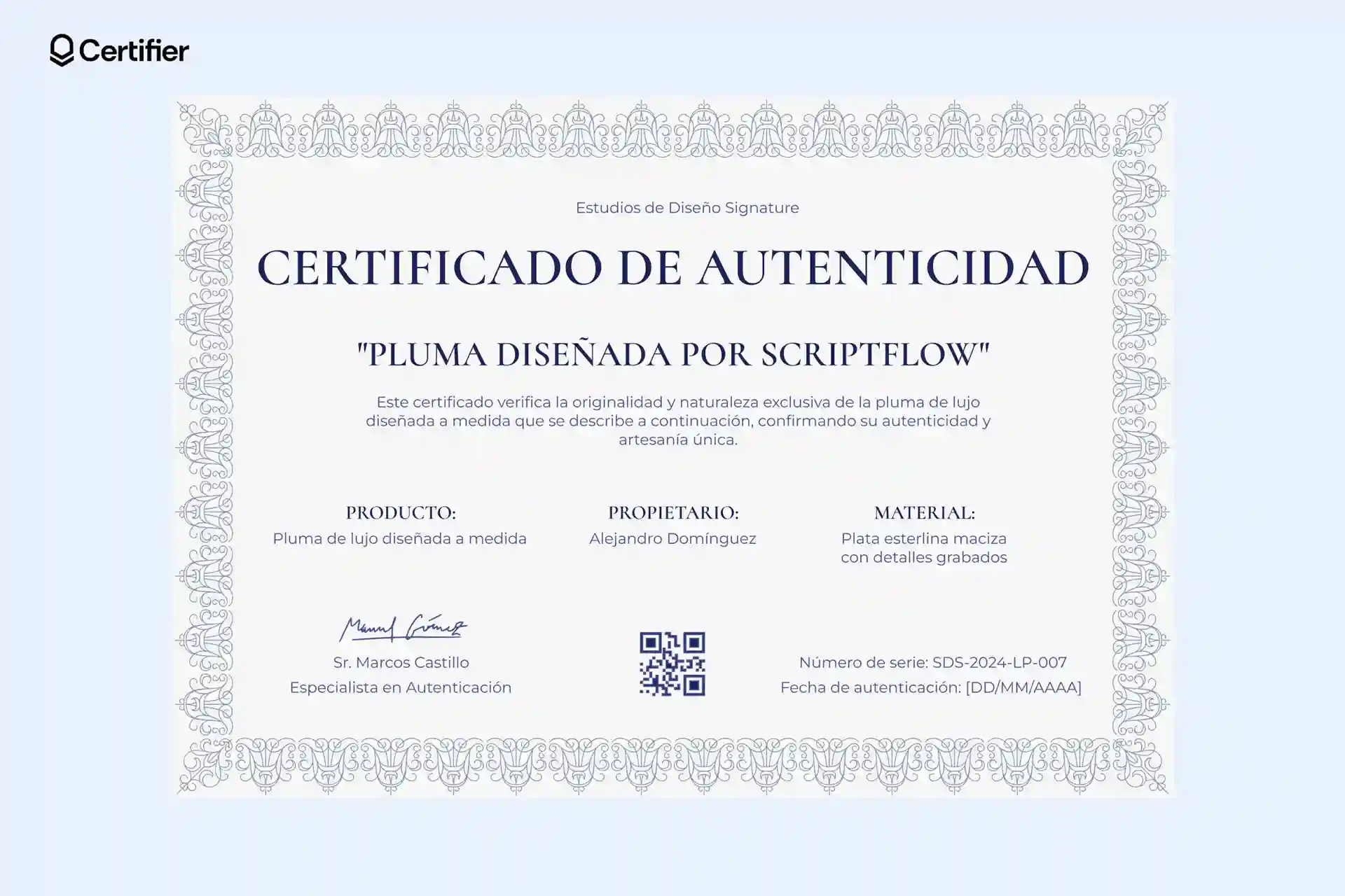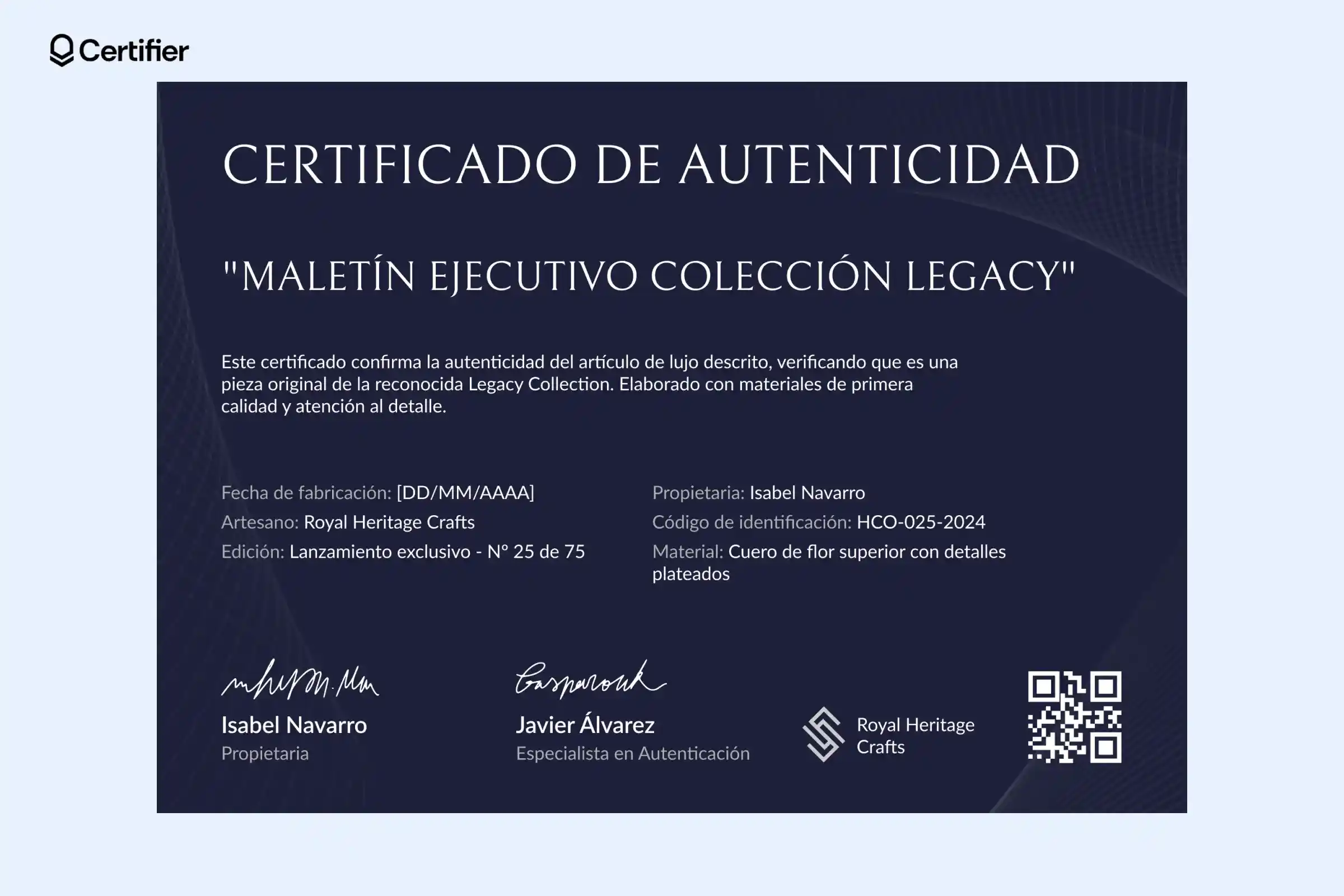 Este certificado de autenticidad incluye espacios dedicados para la fecha de emisión, firmas y un identificador único. El ID del certificado se genera automáticamente, lo que aumenta la credibilidad y facilita la trazabilidad.