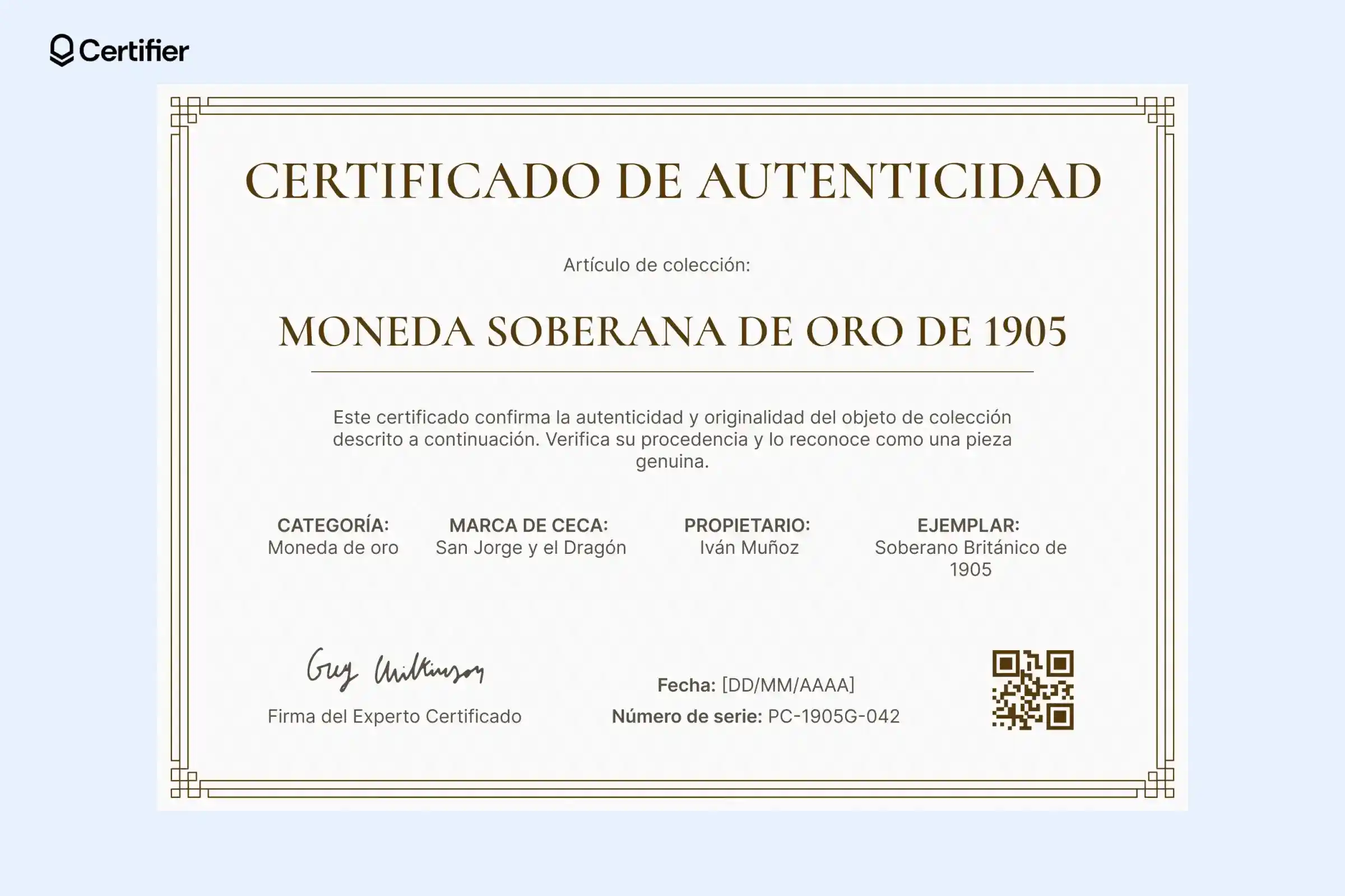 Con un diseño clásico y limpio, esta plantilla certificado de autenticidad PDF facilita la verificación de piezas valiosas. Toda la información importante —categoría, marca de acuñación, propietario— se presenta de forma clara.