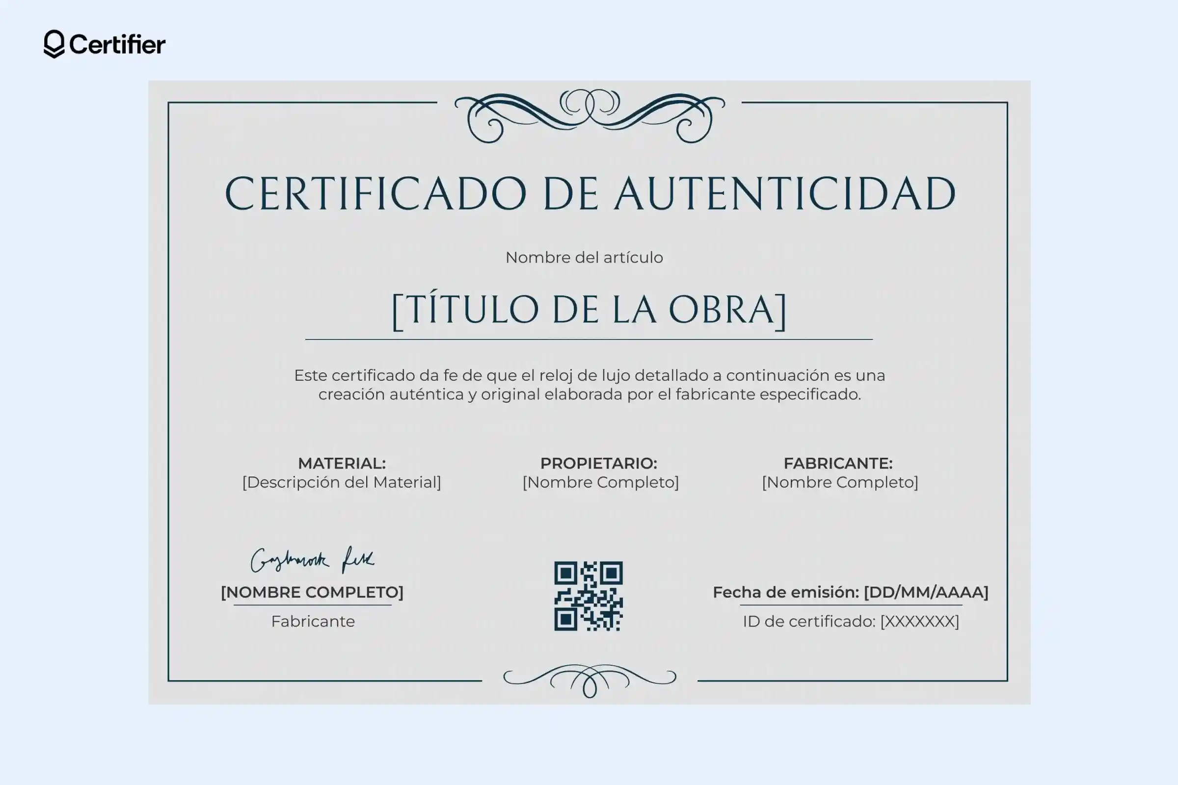 En Certifier, tienes miles de diseños para elegir y personalizar, así que seguro encuentras uno que se adapta a tu estilo. Todas las plantillas de certificado de autenticidad gratis son completamente editables. ¿Quieres cambiar el diseño? Hazlo sin problema.