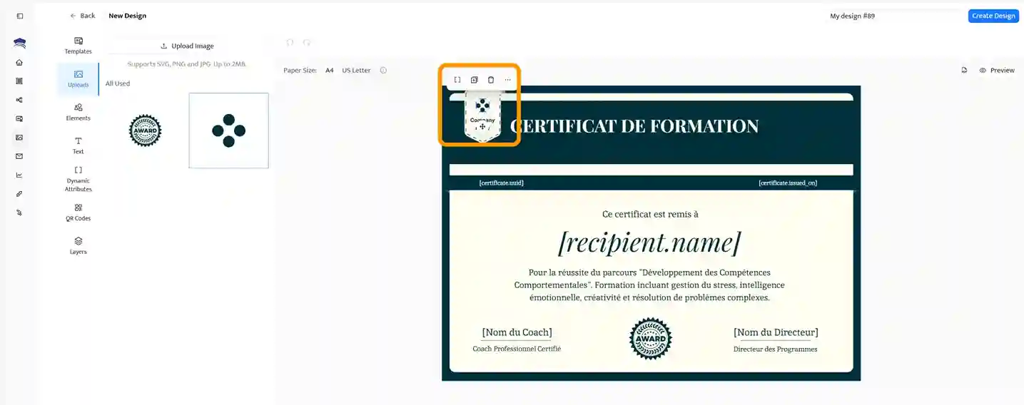 Ajoutez également des éléments de votre marque, comme le logo de votre entreprise, grâce à l’interface glisser-déposer intuitive de Certifier. Rendez-vous dans l’onglet Éléments, importez votre logo et redimensionnez-le selon vos besoins.