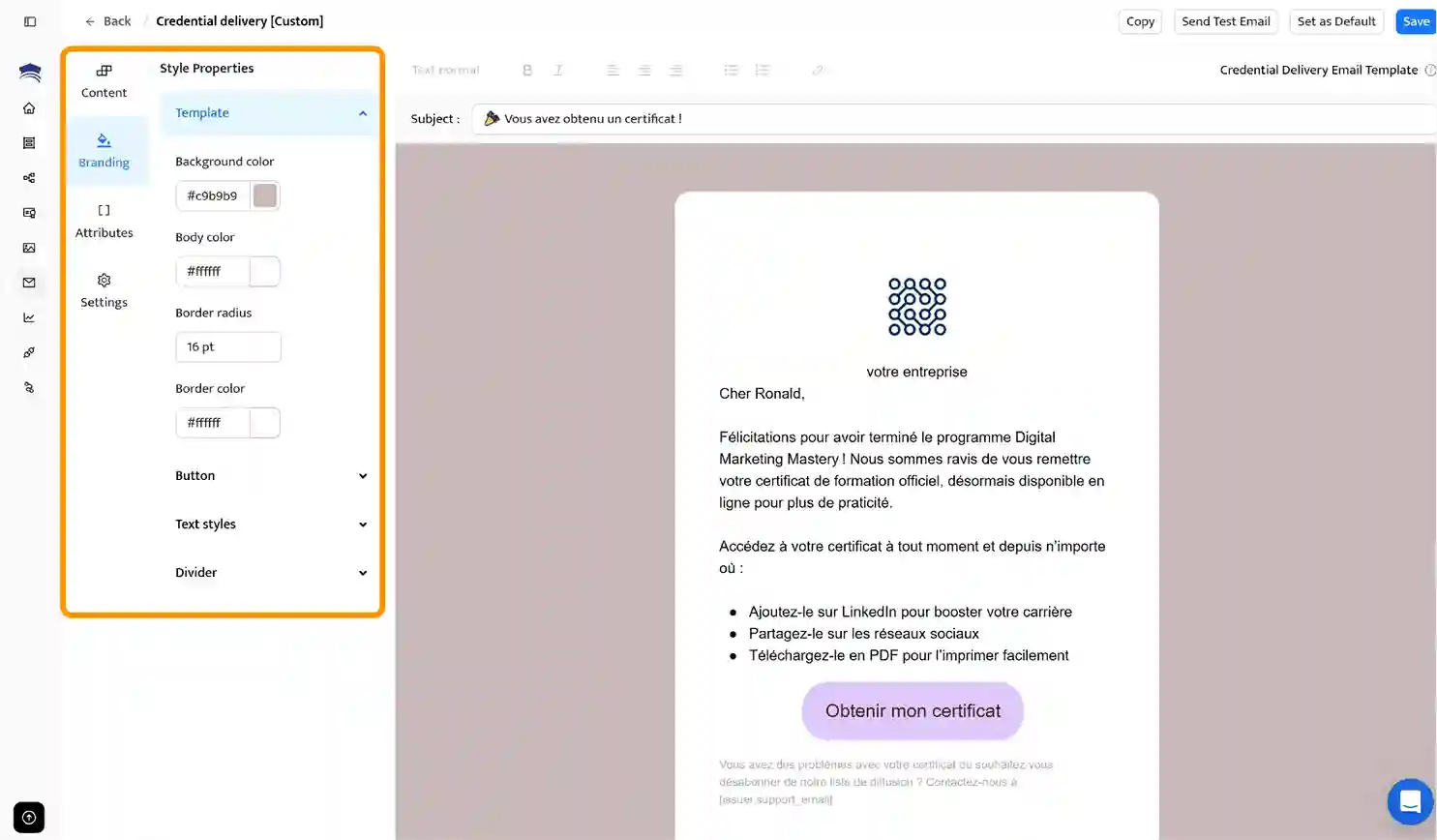 Dans cet onglet, personnaliser le message : modifiez les couleurs, le ton, les polices, ajoutez votre logo et associez les bons attributs dynamiques.