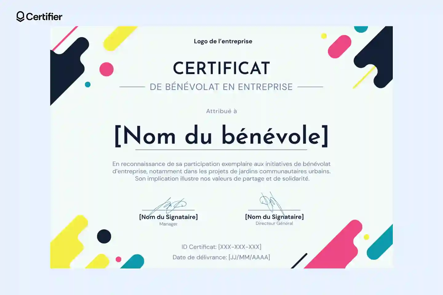 Ce certificat convient à de nombreux types de formations, par exemple les formations, la participation, le bénévolat, etc.
