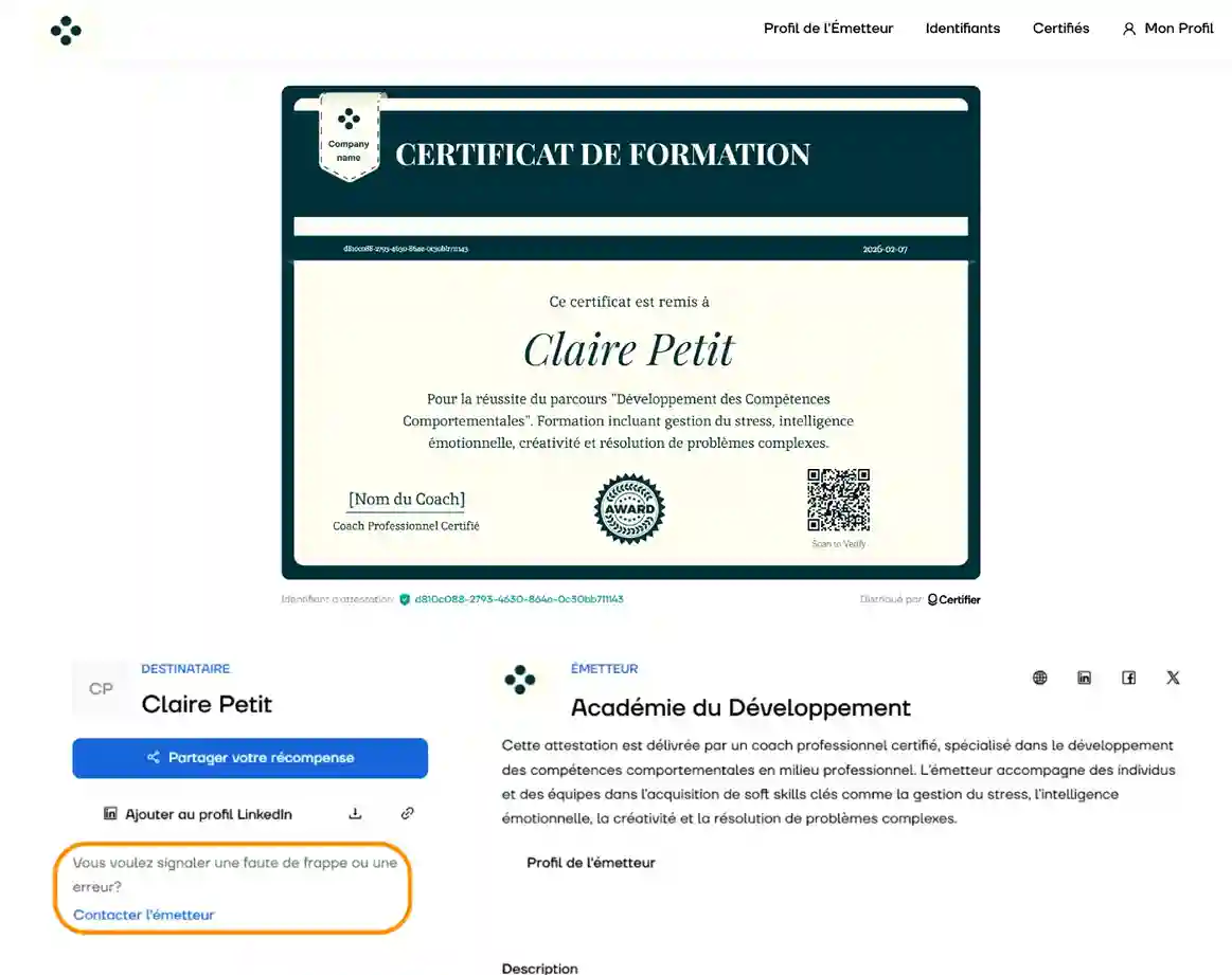 À noter : Même après expiration, votre certificat reste visible dans votre portefeuille numérique Certifier. Il sera indiqué comme “non valide”, mais toujours accessible. Votre certificat de formation ne disparaît pas – vous pouvez y accéder à tout moment !