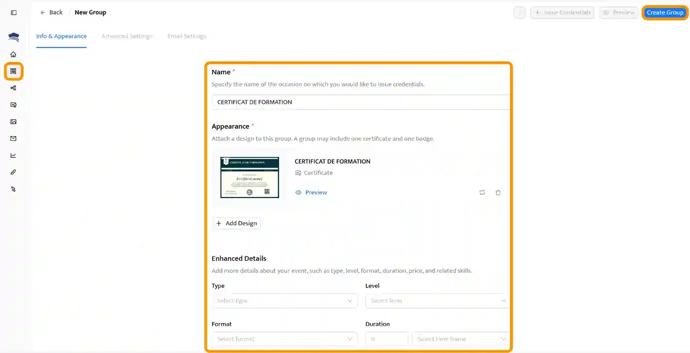 Vous êtes maintenant prêt à diffuser vos modèles de certificat de formation. Dans l’onglet groupes, sélectionnez + Create Group, puis cliquez sur Créer nouveau.