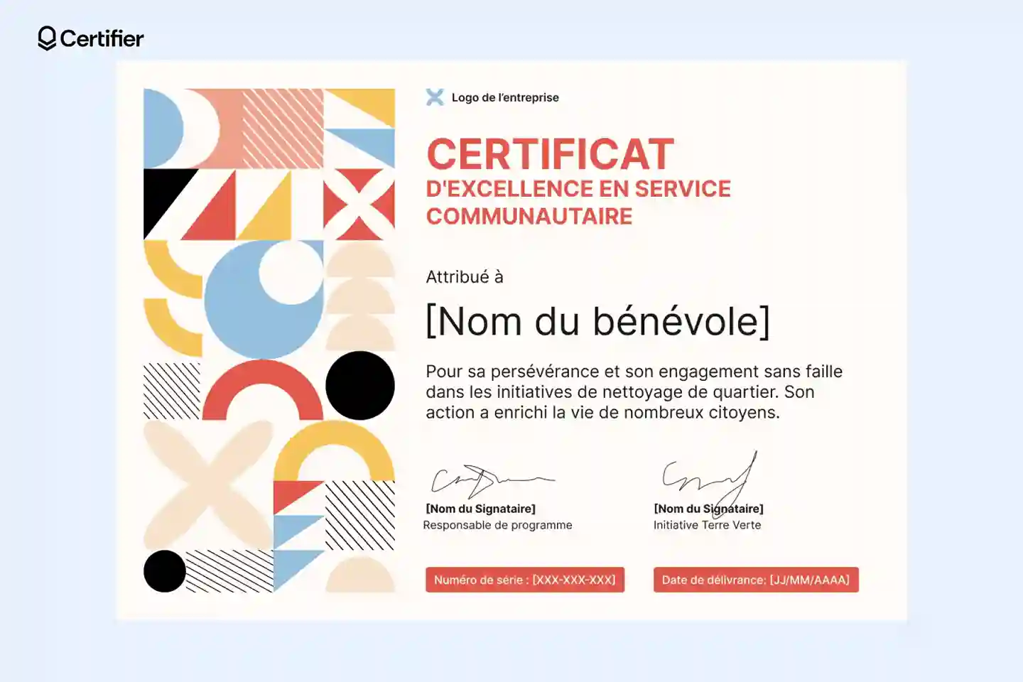 Comment ? En utilisant des modèles prêts à l'emploi. Inscrivez-vous dès aujourd'hui à Certifier pour créer, personnaliser et gérer rapidement et facilement vos certificats.