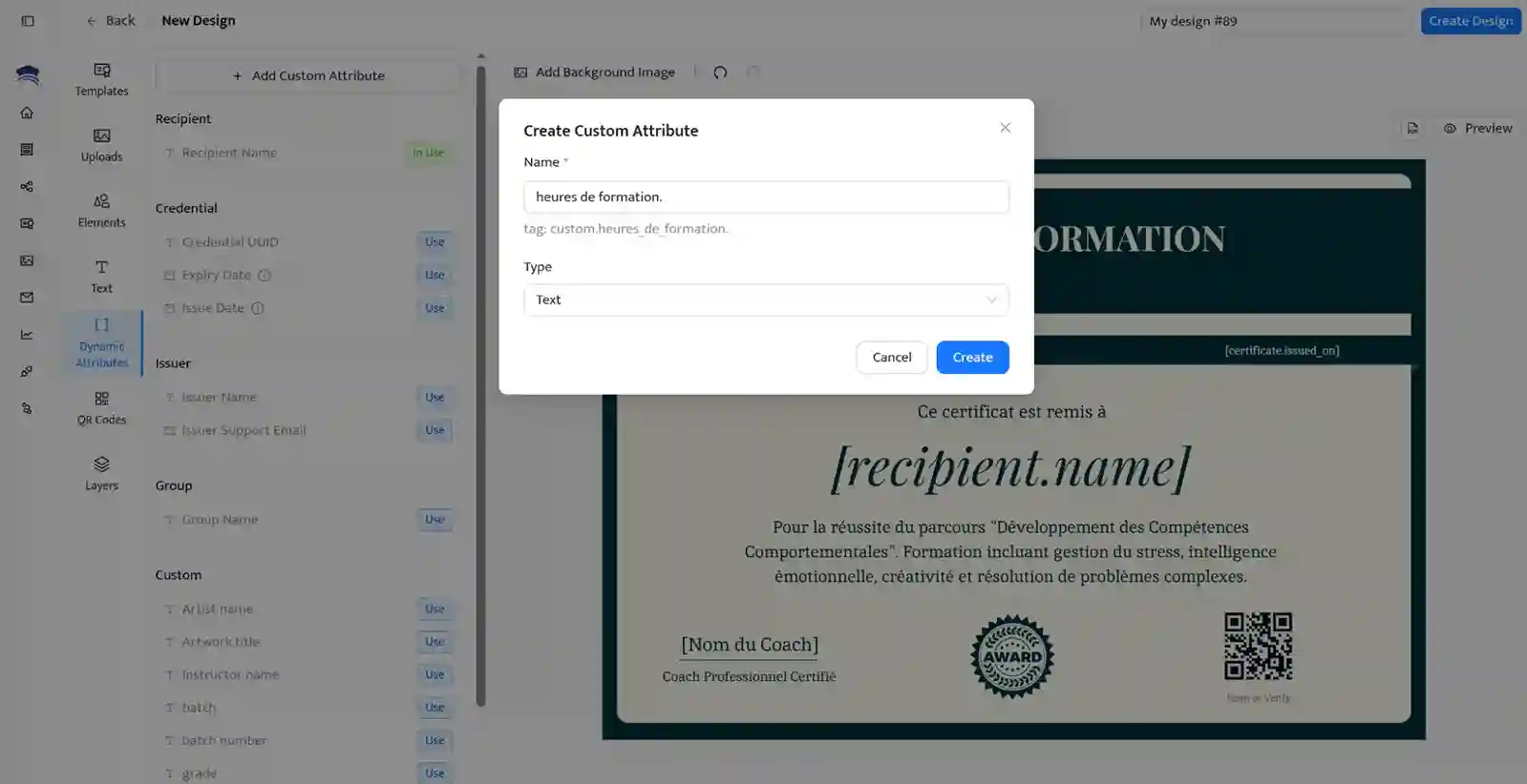 Les attributs dynamiques sont des champs automatiques qui se remplissent à partir de votre fichier tableur – nom, date, durée de la formation, etc. C’est le secret pour créer un certificat de formation personnalisé en quelques minutes.
