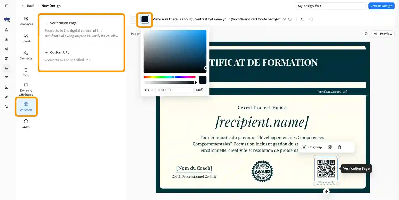 Peaufinez encore davantage le design de votre certificat de formation : vous pouvez même modifier la couleur du code QR pour qu’il s’harmonise avec le modèle.