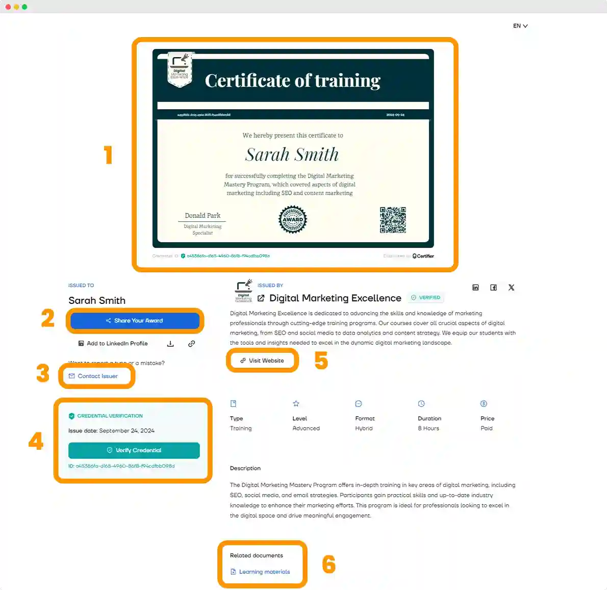 Utiliser des options comme la vérification numérique et le statut d’émetteur vérifié garantit l’authenticité de chaque certificat. Ces certificats validés confirment que les connaissances ont bien été acquises, renforçant ainsi la crédibilité de votre programme.