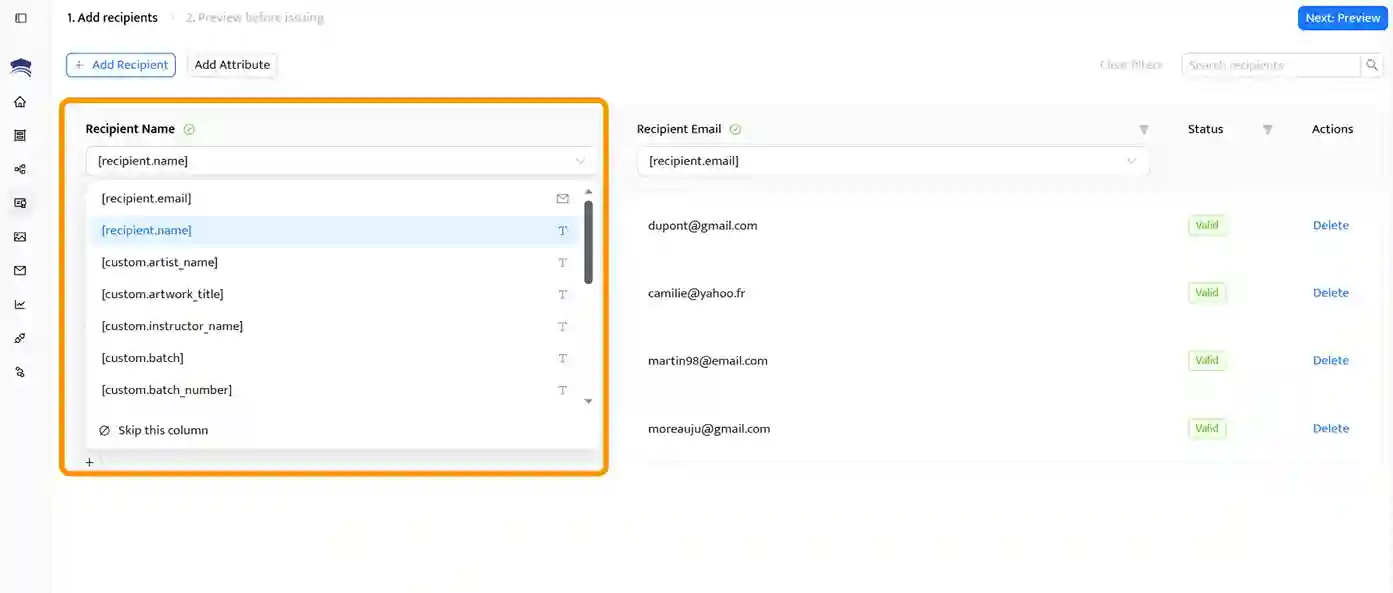 En cliquant sur Ignorer cette colonne, vous pouvez télécharger les certificats sans les envoyer par e-mail. C’est une bonne option si vous souhaitez remettre les certificats de formation manuellement.