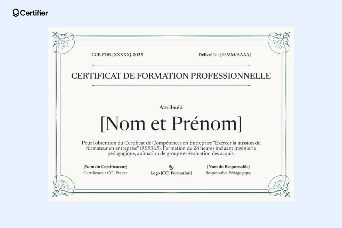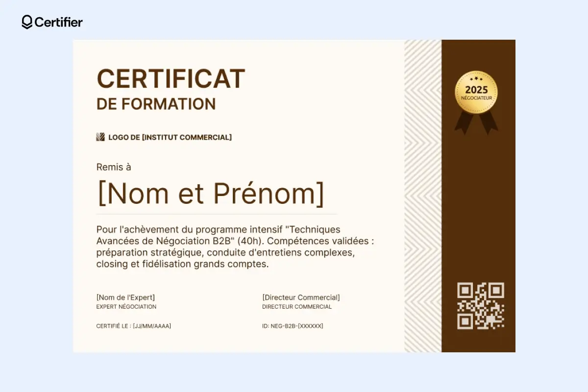 Comment certifier un programme de formation plus rapidement ? La réponse est simple : utilisez des modèles prêts à l’emploi et générez vos certificats à partir d’un fichier tableur. Certifier propose plus de 1 000 modèles professionnels que vous pouvez adapter librement.