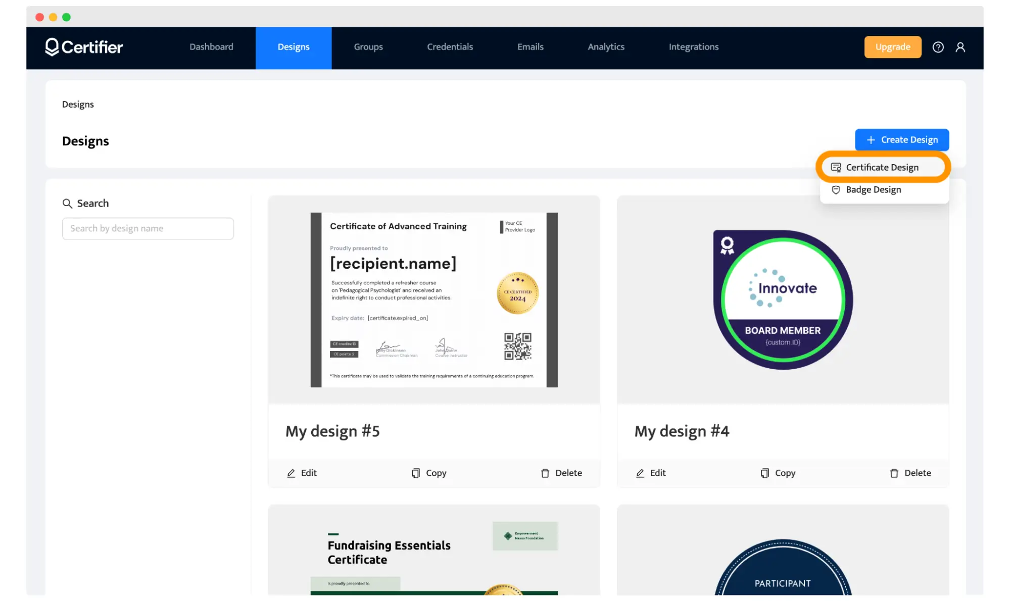 Ensuite, vous pouvez passer à créer un diplôme personnalisé en ligne, prêt à être réutilisé si nécessaire. Allez dans l’onglet Design, puis cliquez sur "Create Design". Choisissez un modèle de diplôme.