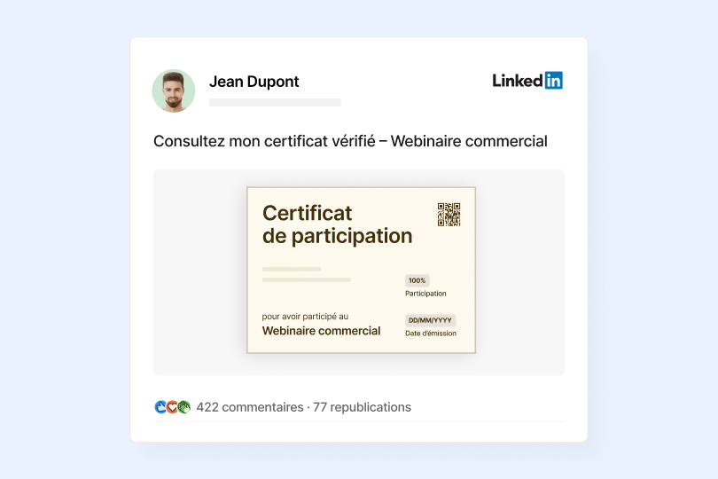 Transformez chaque certificat en levier de visibilité. Avec le partage en un clic et des publications LinkedIn préremplies, les participants valorisent leur présence, développent leur réseau et font rayonner votre événement.